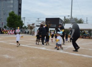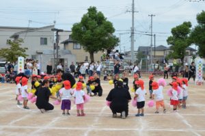 5歳児のリレー♪ 4歳児のバルーン演技♬ 3歳児のダンス「おどるポンポコリン」♪