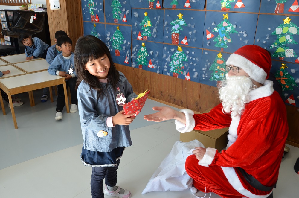 今日は楽しみにしていたクリスマス会。きりん組さんのクリスマスメドレーやハンドベル演奏をみんなで聞きました。すると、どこからか鈴の音が…音のする方を見てみたらサンタさん登場!サンタさんと一緒に歌を歌ったり、サンタさんへ質問したり。「サンタさんは何歳なの?サンタさんの好きな食べ物は何??なぜ、そりは空を飛ぶの???」などなど。もちろんサンタさんは英語で答えてくれます。それを園長先生が通訳してみんなに教えてくれました(笑)
