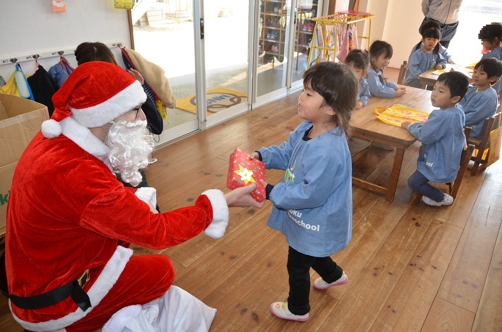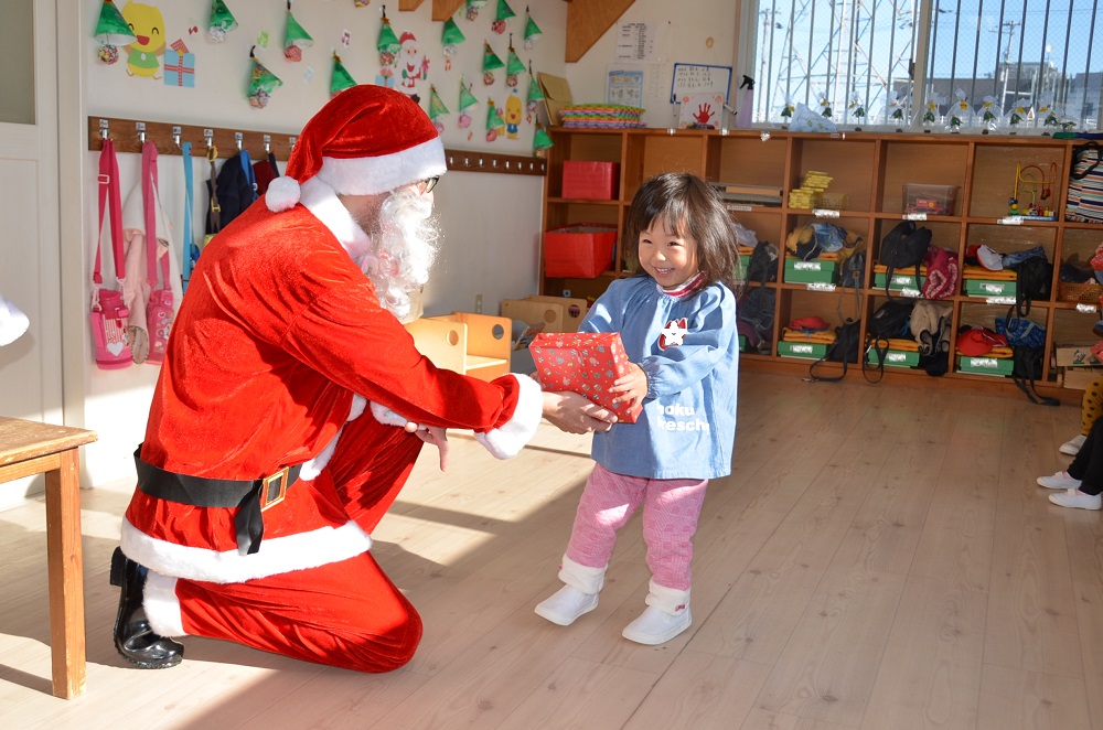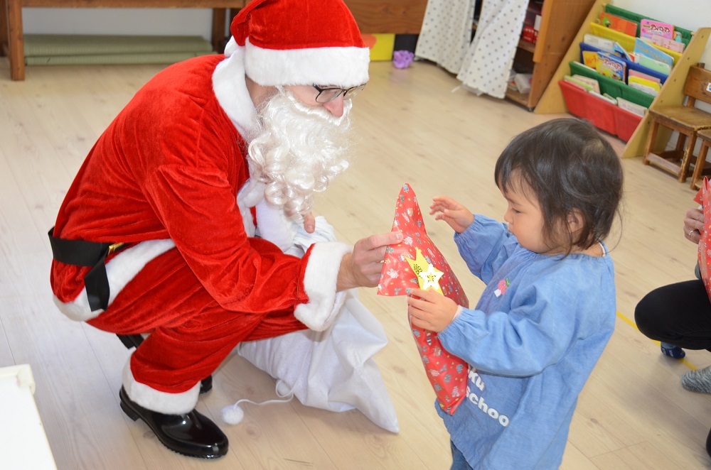 今日は楽しみにしていたクリスマス会。きりん組さんのクリスマスメドレーやハンドベル演奏をみんなで聞きました。すると、どこからか鈴の音が…音のする方を見てみたらサンタさん登場!サンタさんと一緒に歌を歌ったり、サンタさんへ質問したり。「サンタさんは何歳なの?サンタさんの好きな食べ物は何??なぜ、そりは空を飛ぶの???」などなど。もちろんサンタさんは英語で答えてくれます。それを園長先生が通訳してみんなに教えてくれました(笑)