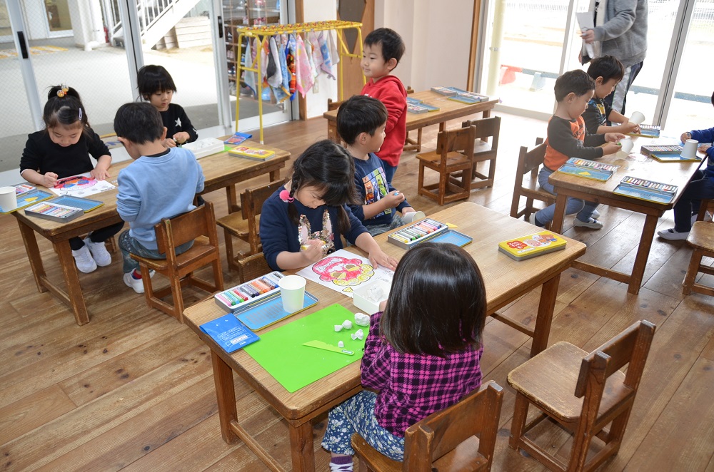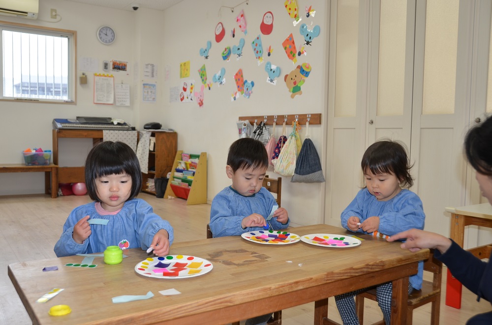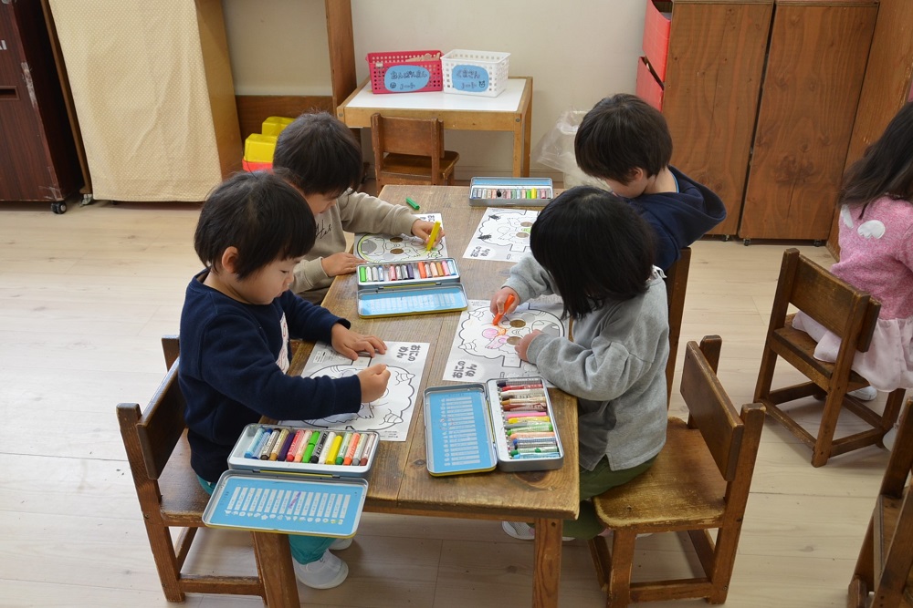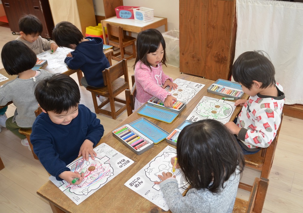 ぱんだ組さんとりす組さんは節分の制作でおめんと豆入れを作りました。こわーい鬼のお面を作ったんですが・・・カラフルな可愛らしいお面ができあがりました(*^▽^*)