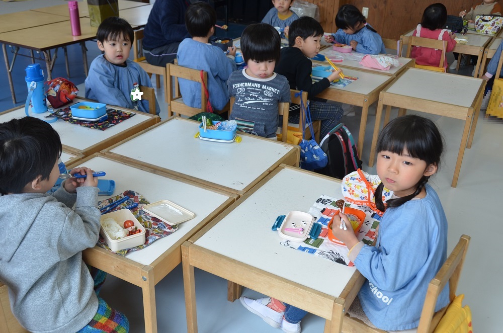 今月も異年齢交流のため、みんないつもと違うお部屋、いつもと違うお友達と手作り弁当をおいしくいただきました。今日は園長先生も手作り弁当を持って、きりん組さんでみんなと楽しくお昼を過ごされました。