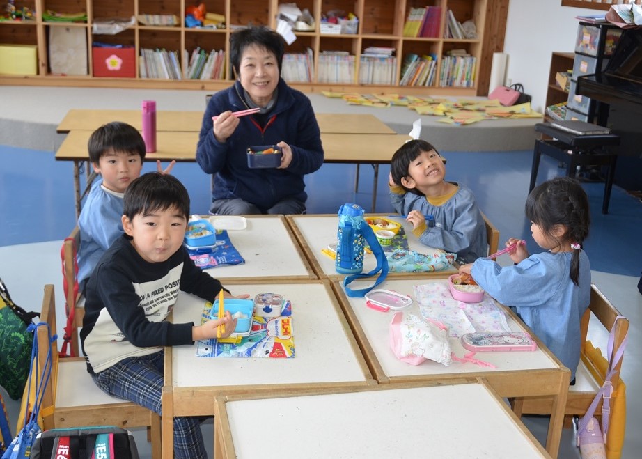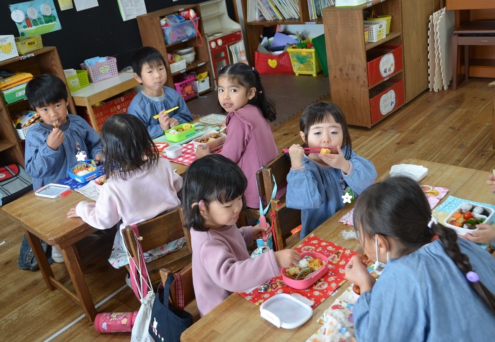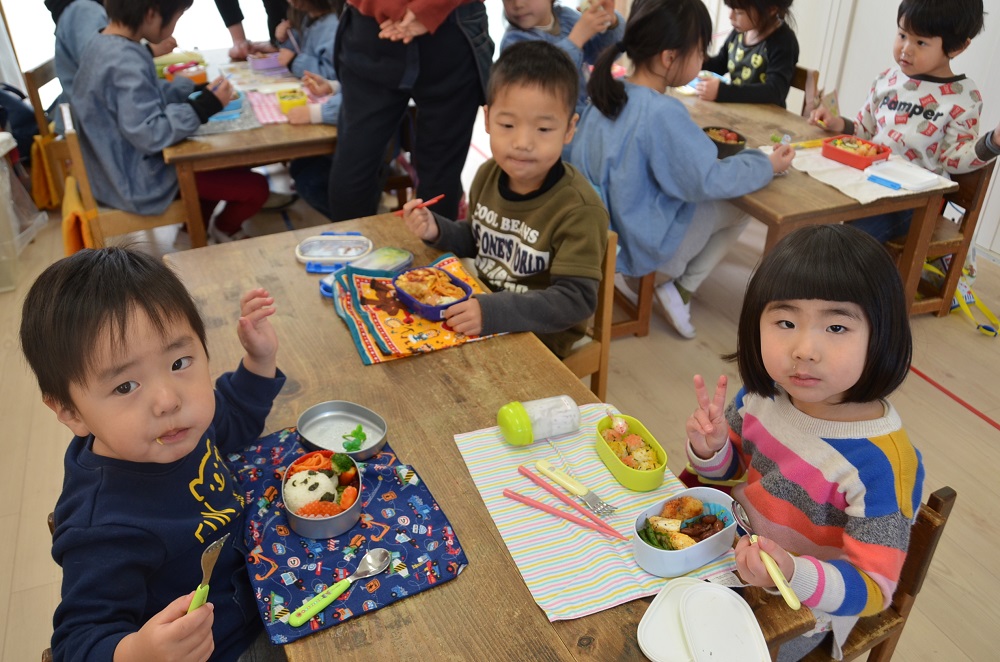 今月も異年齢交流のため、みんないつもと違うお部屋、いつもと違うお友達と手作り弁当をおいしくいただきました。今日は園長先生も手作り弁当を持って、きりん組さんでみんなと楽しくお昼を過ごされました。