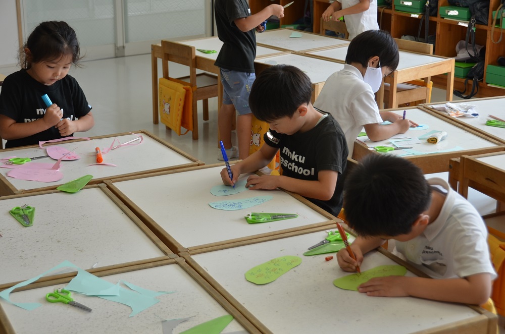 自分の足のサイズを測り、形に切って模様を描いたり、貼りました🎨