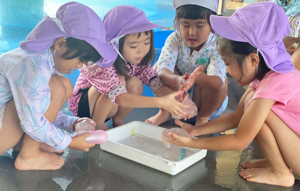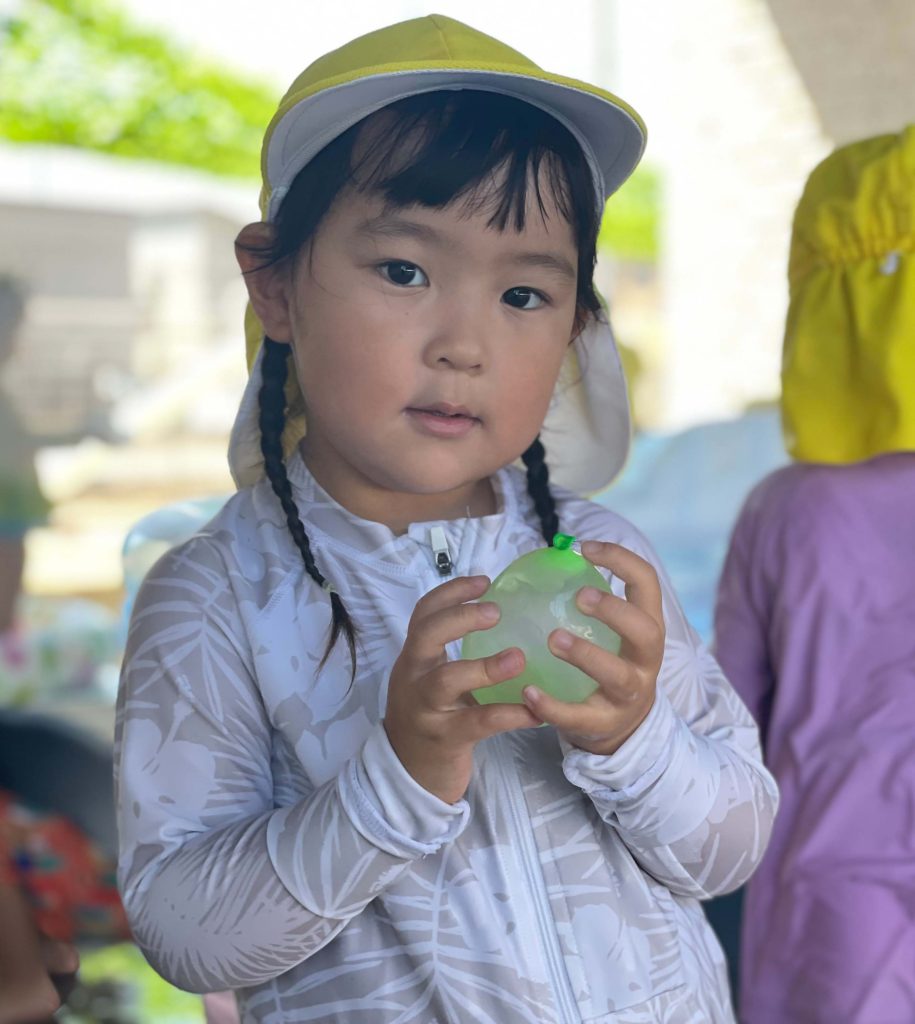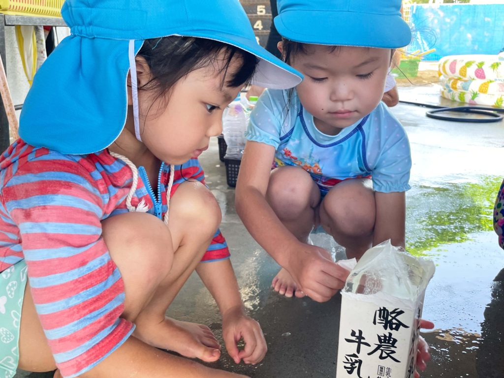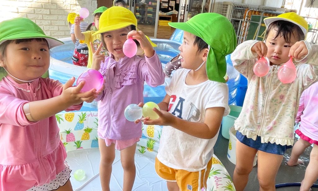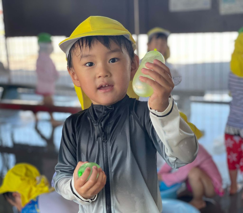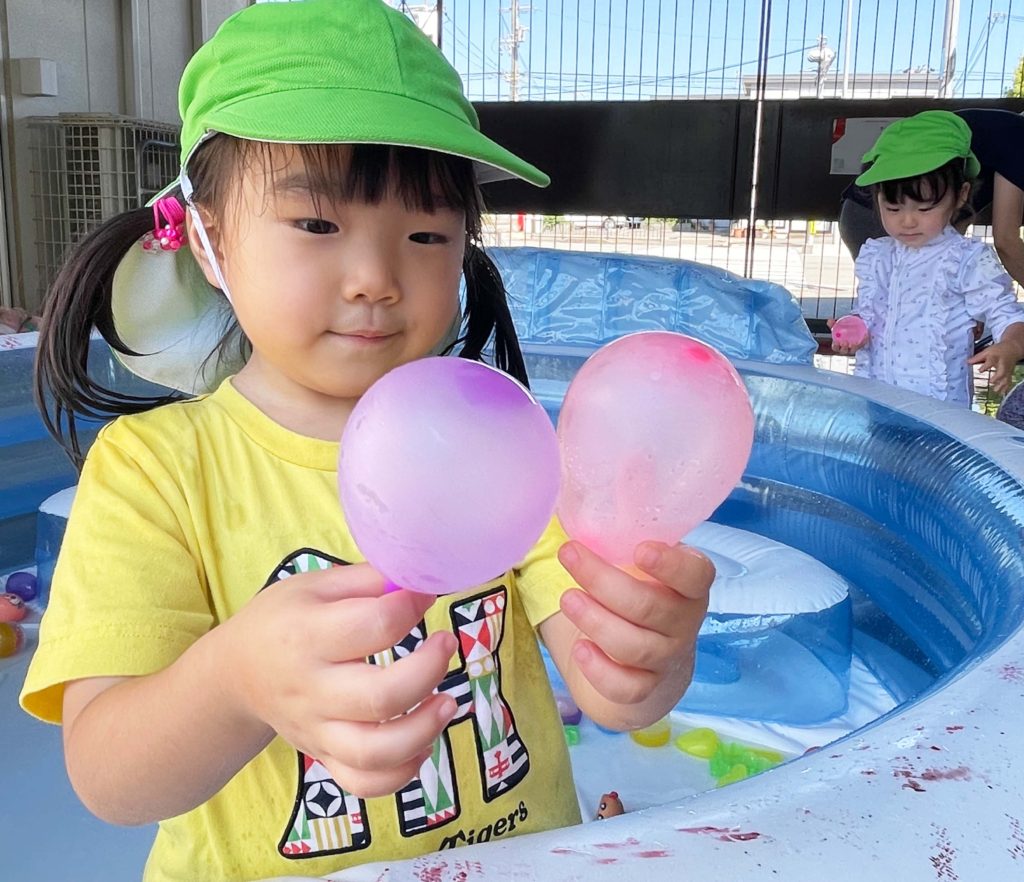 水ふうせん、色水、牛乳パックで作った氷で遊んだよ!!🎈🧊