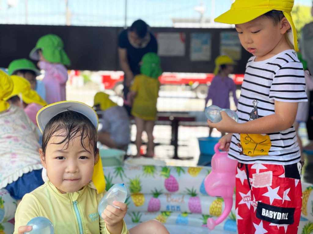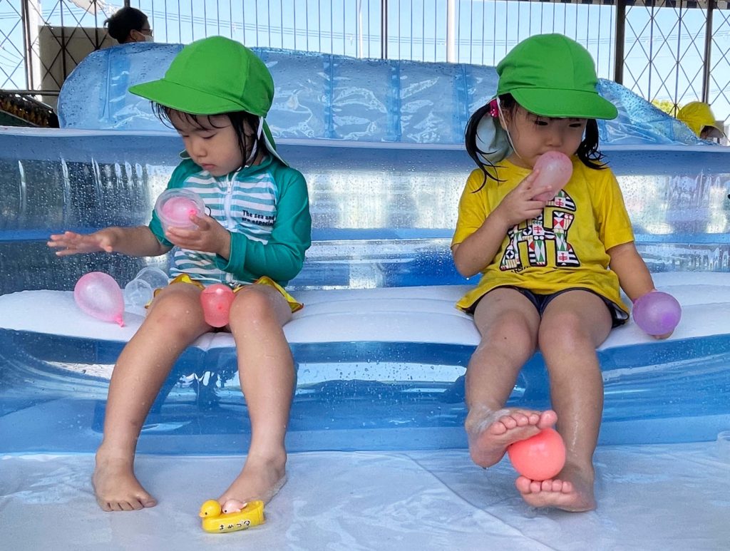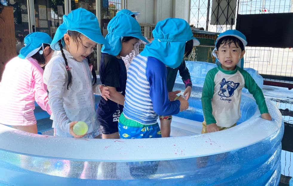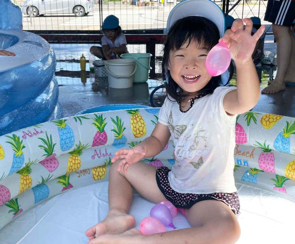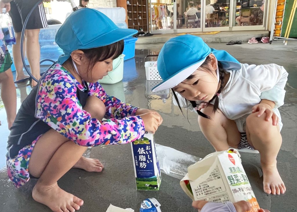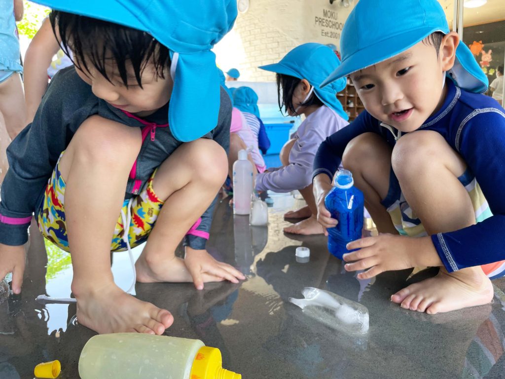 水ふうせん、色水、牛乳パックで作った氷で遊んだよ!!🎈🧊