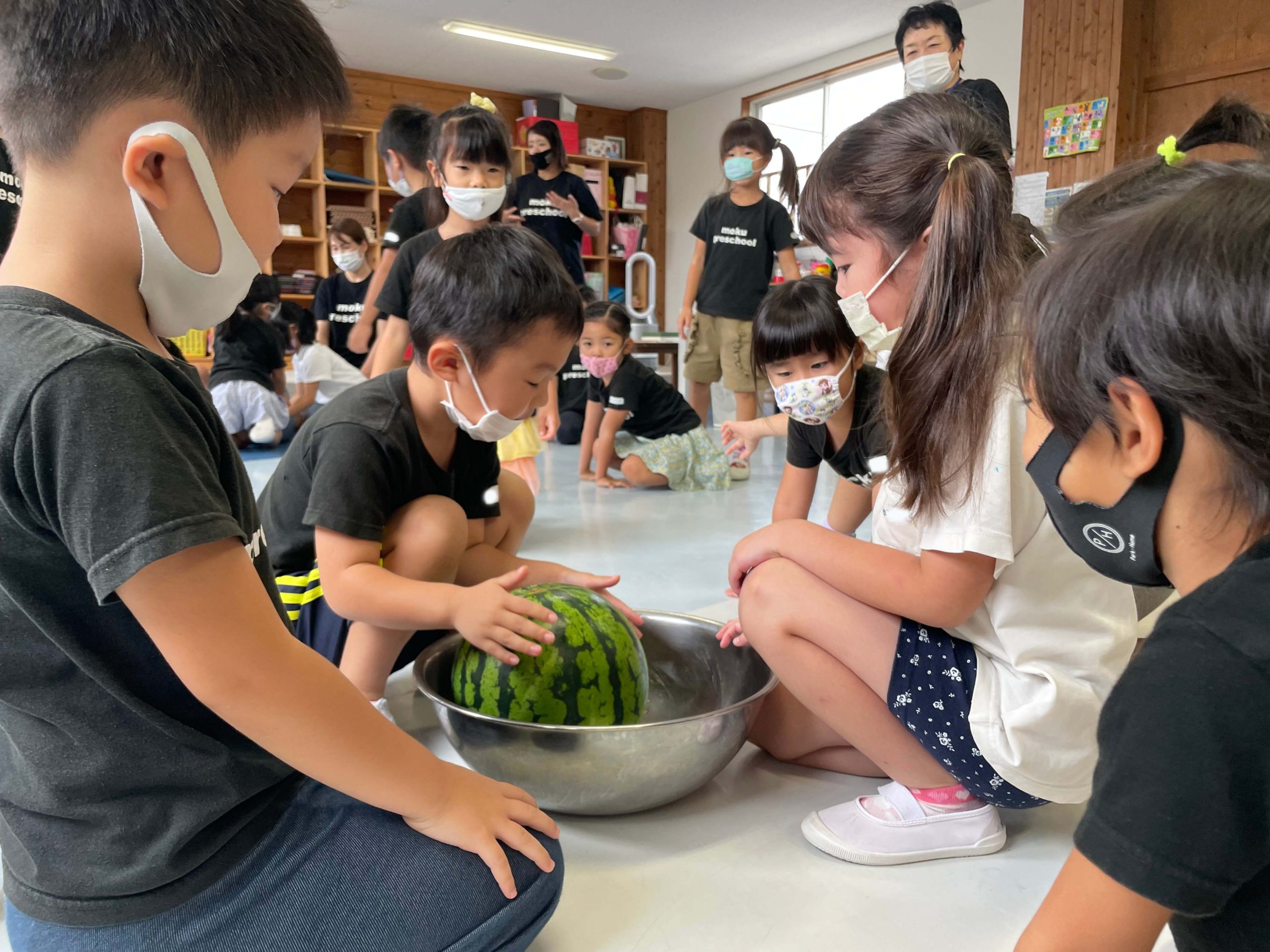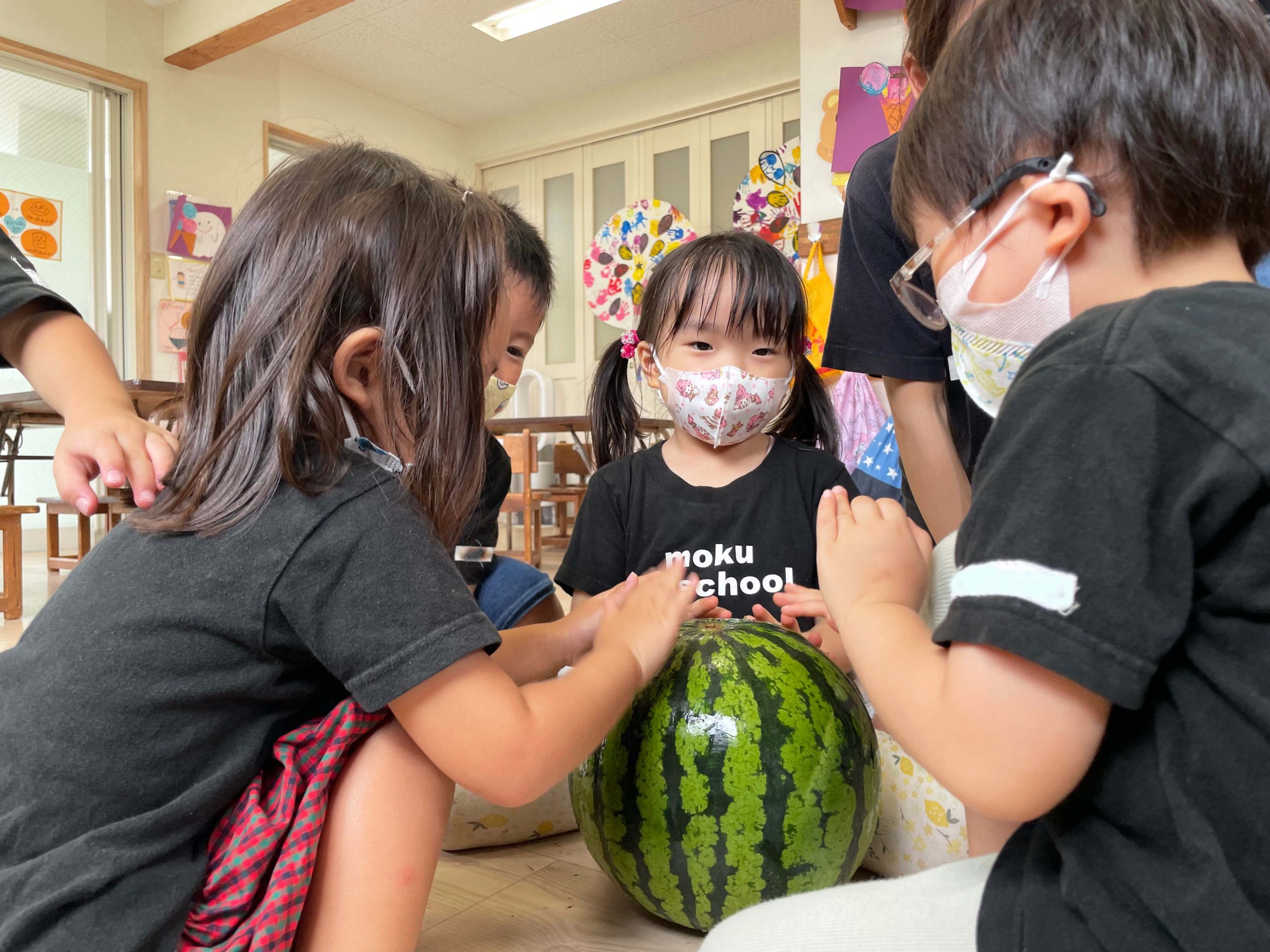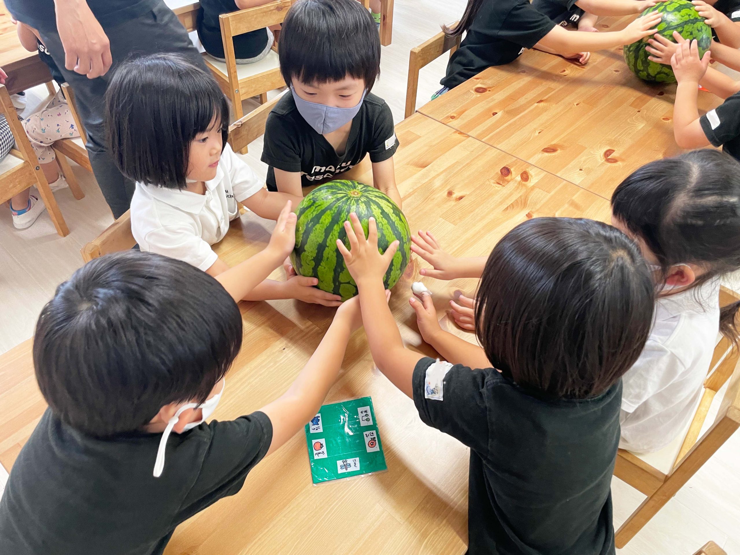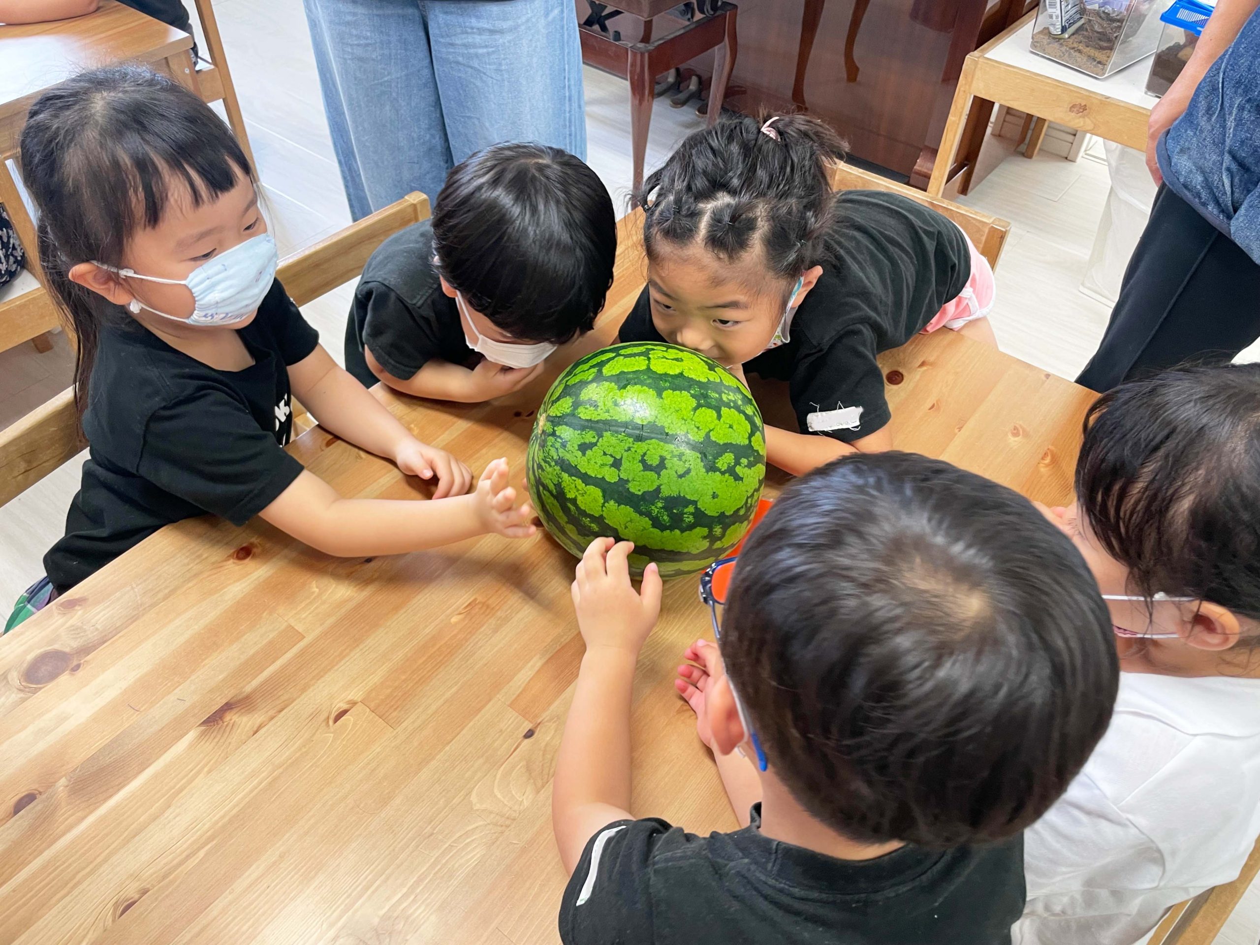切る前のまんまるなままのスイカを見て、触って、持ってみて、音を聞いて、食べてみていろんな感覚で学ぶことができました💡🍉