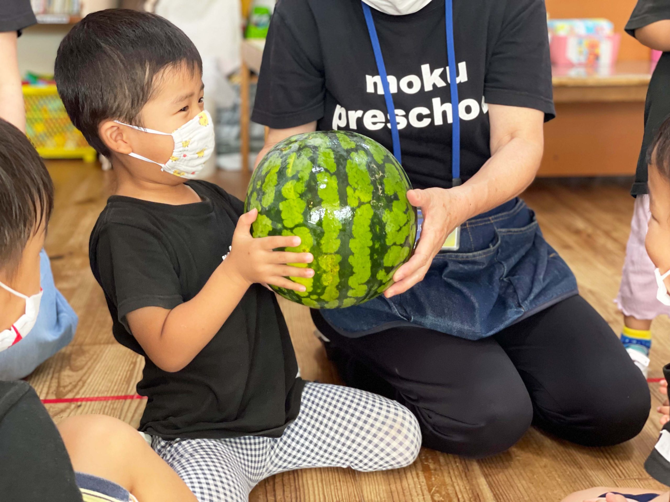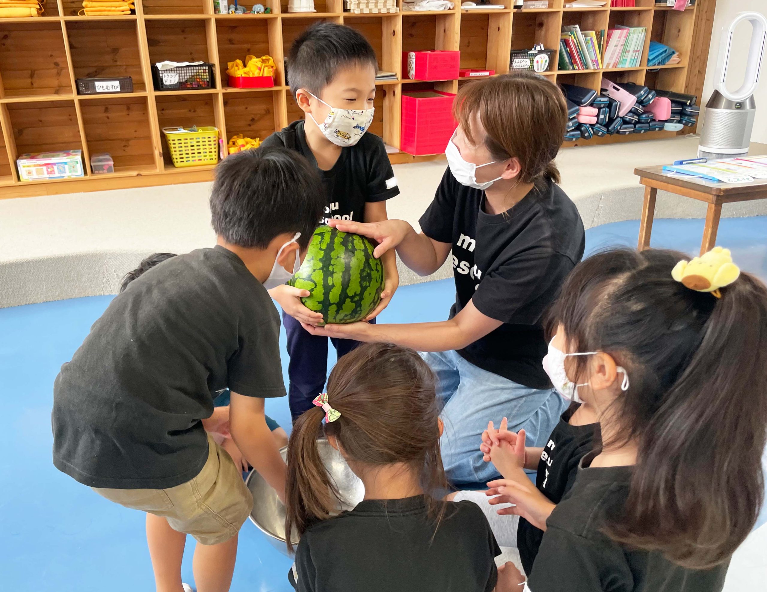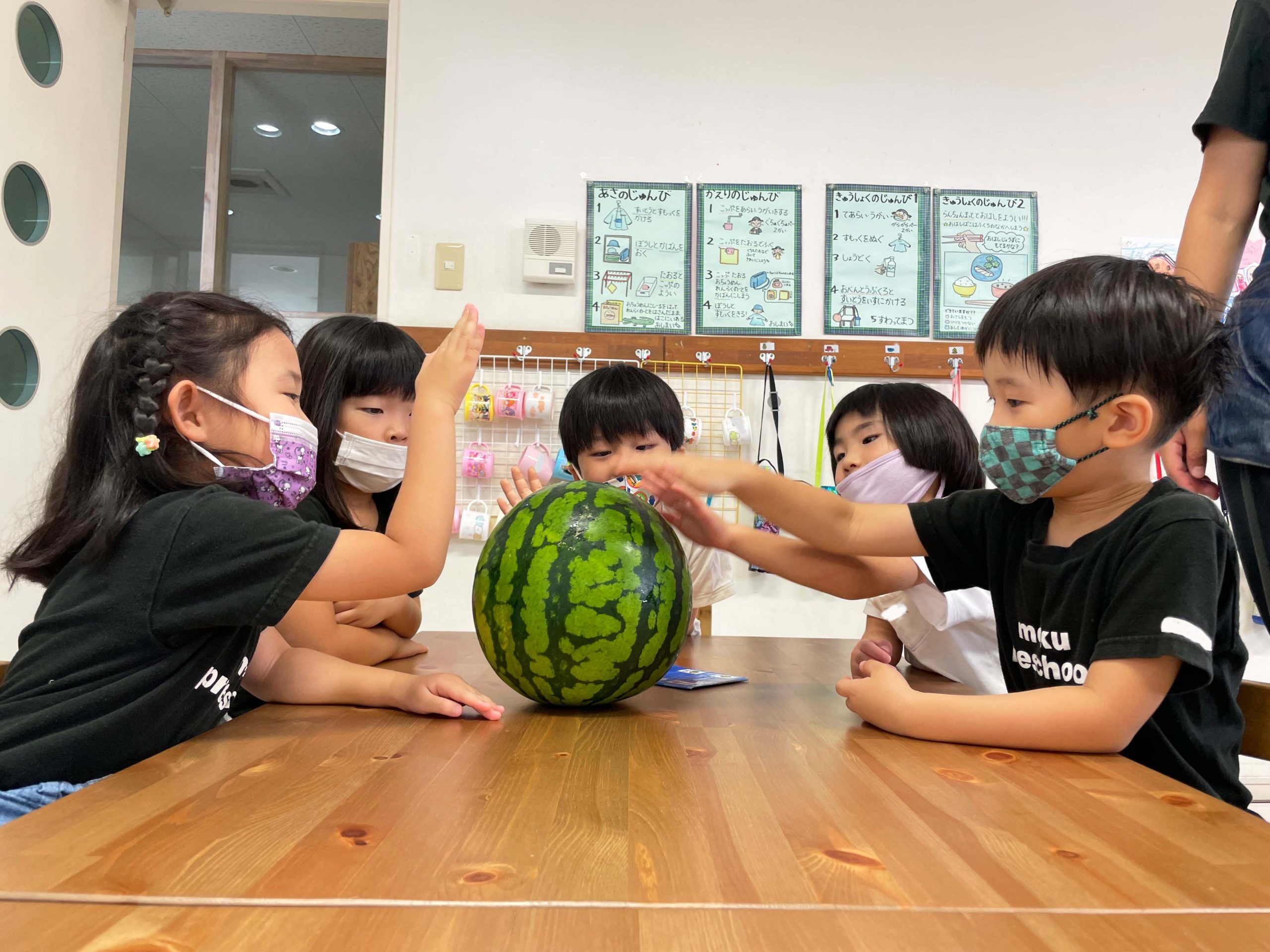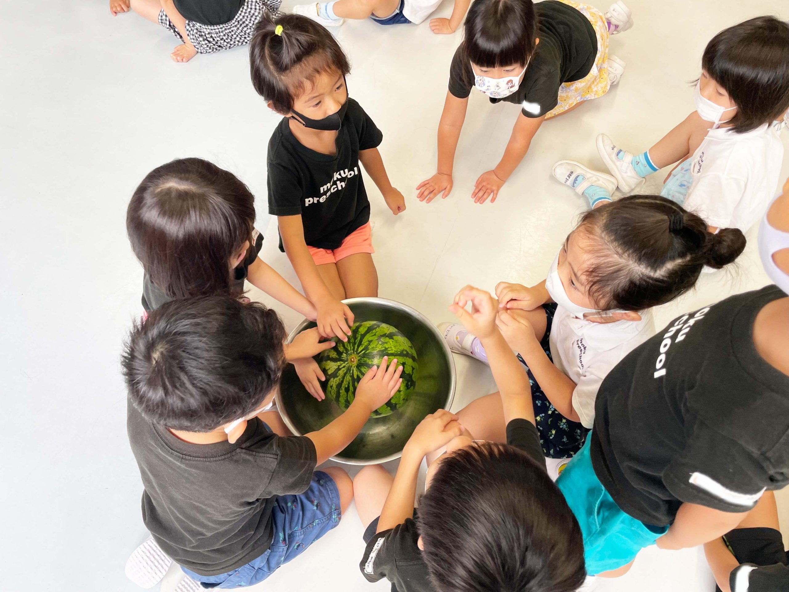 切る前のまんまるなままのスイカを見て、触って、持ってみて、音を聞いて、食べてみていろんな感覚で学ぶことができました💡🍉