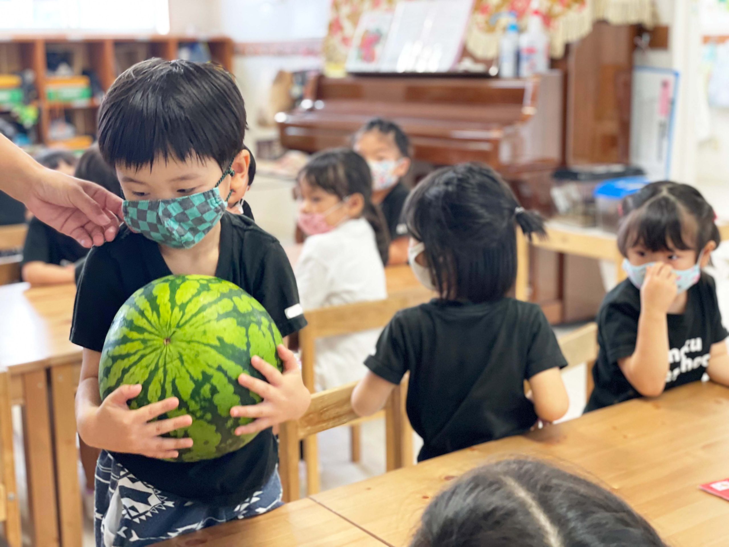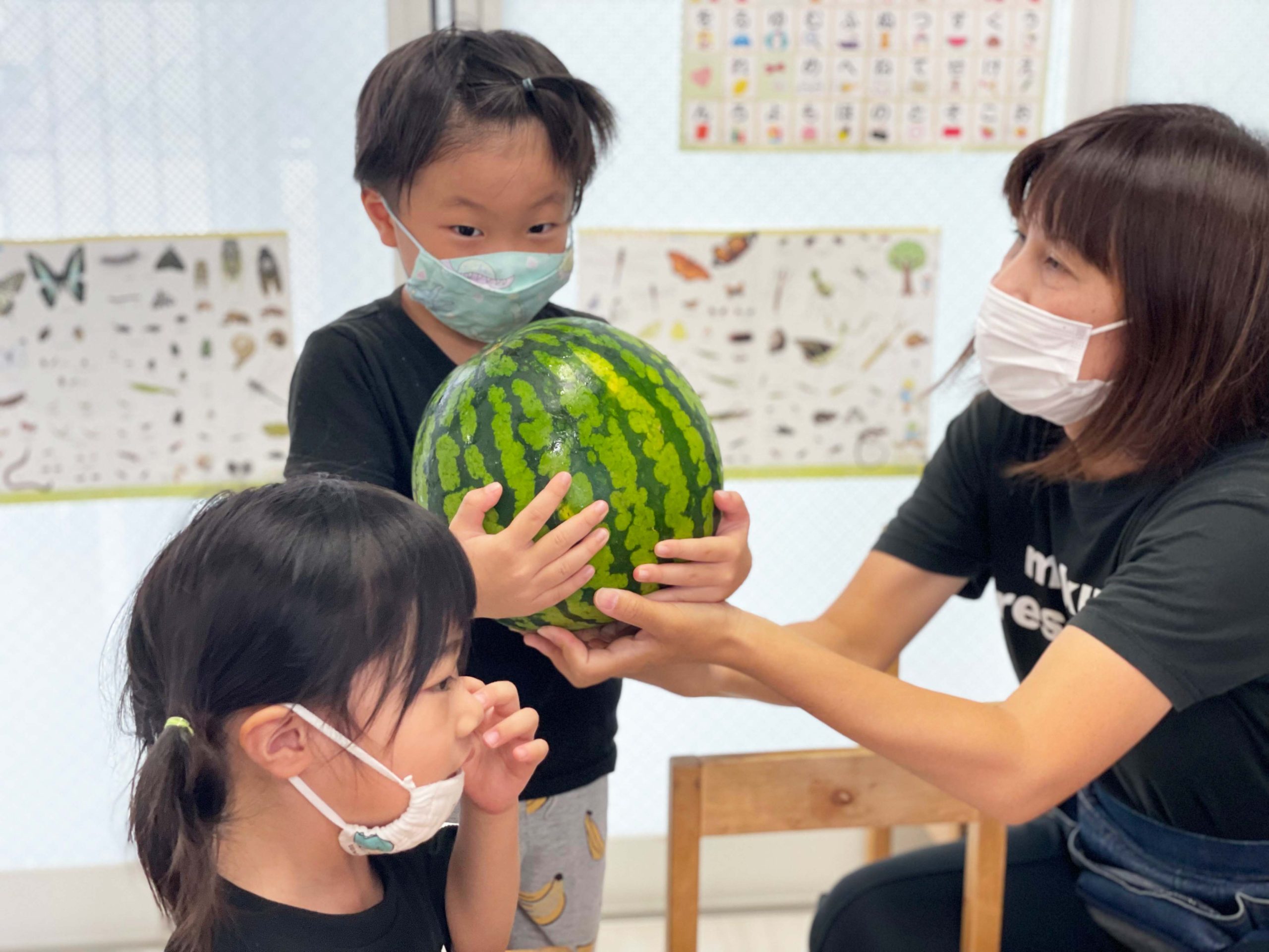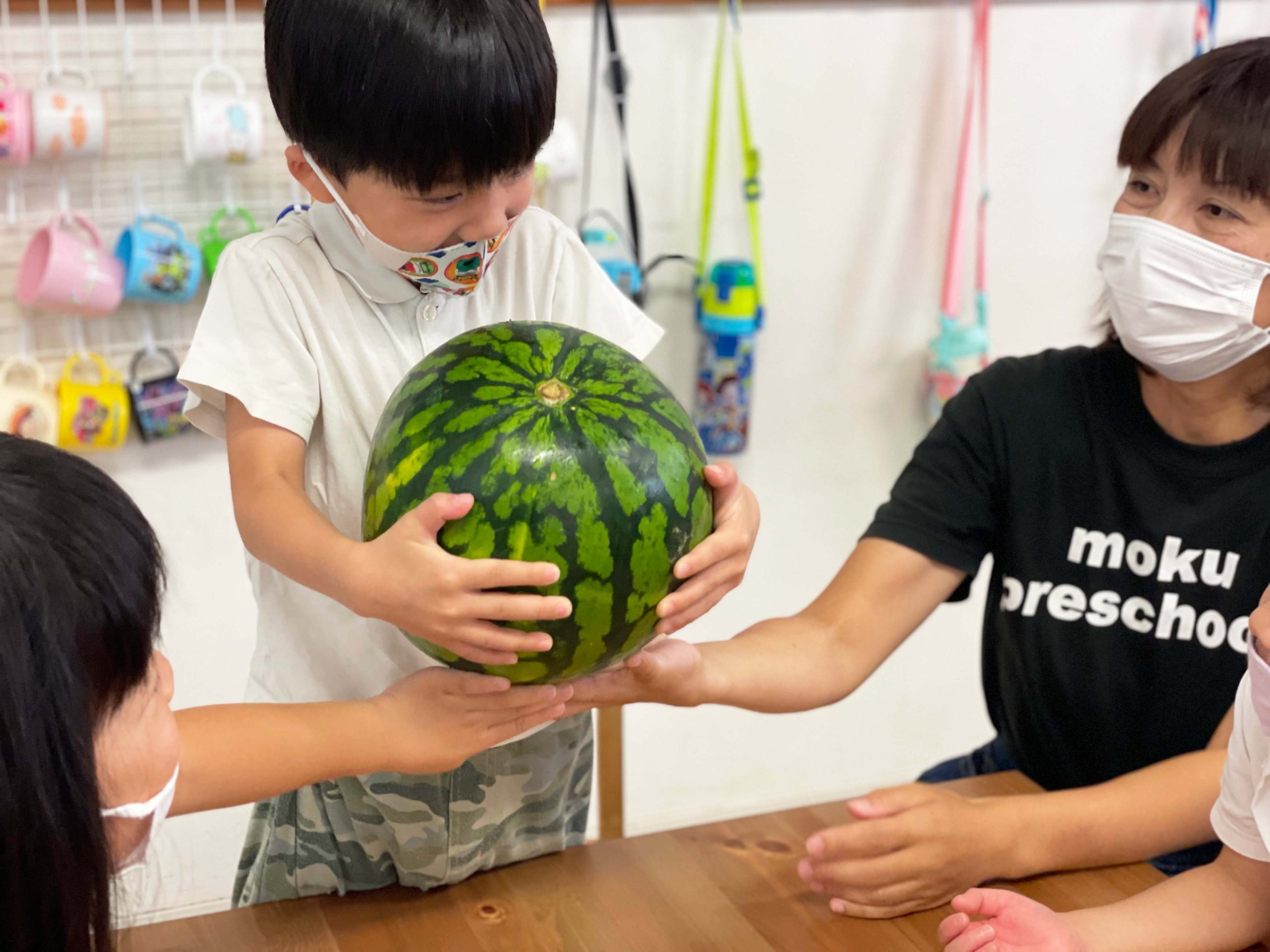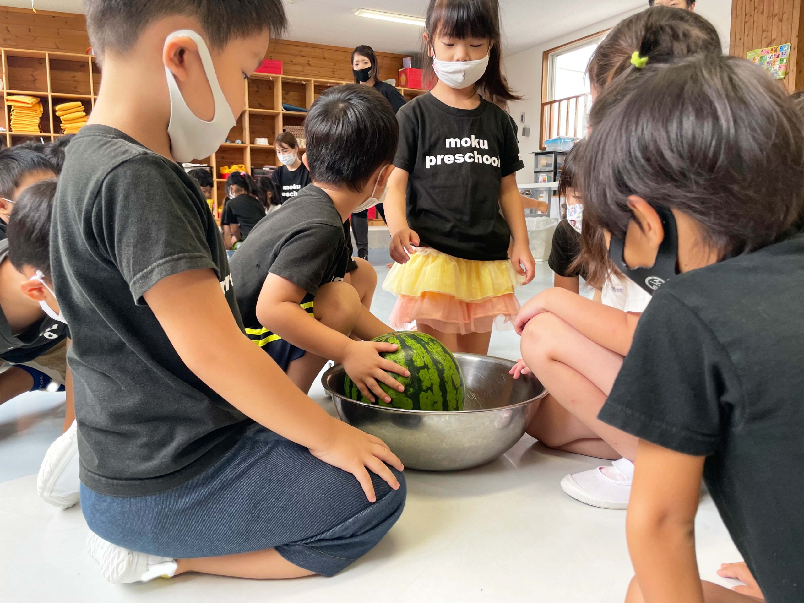 切る前のまんまるなままのスイカを見て、触って、持ってみて、音を聞いて、食べてみていろんな感覚で学ぶことができました💡🍉
