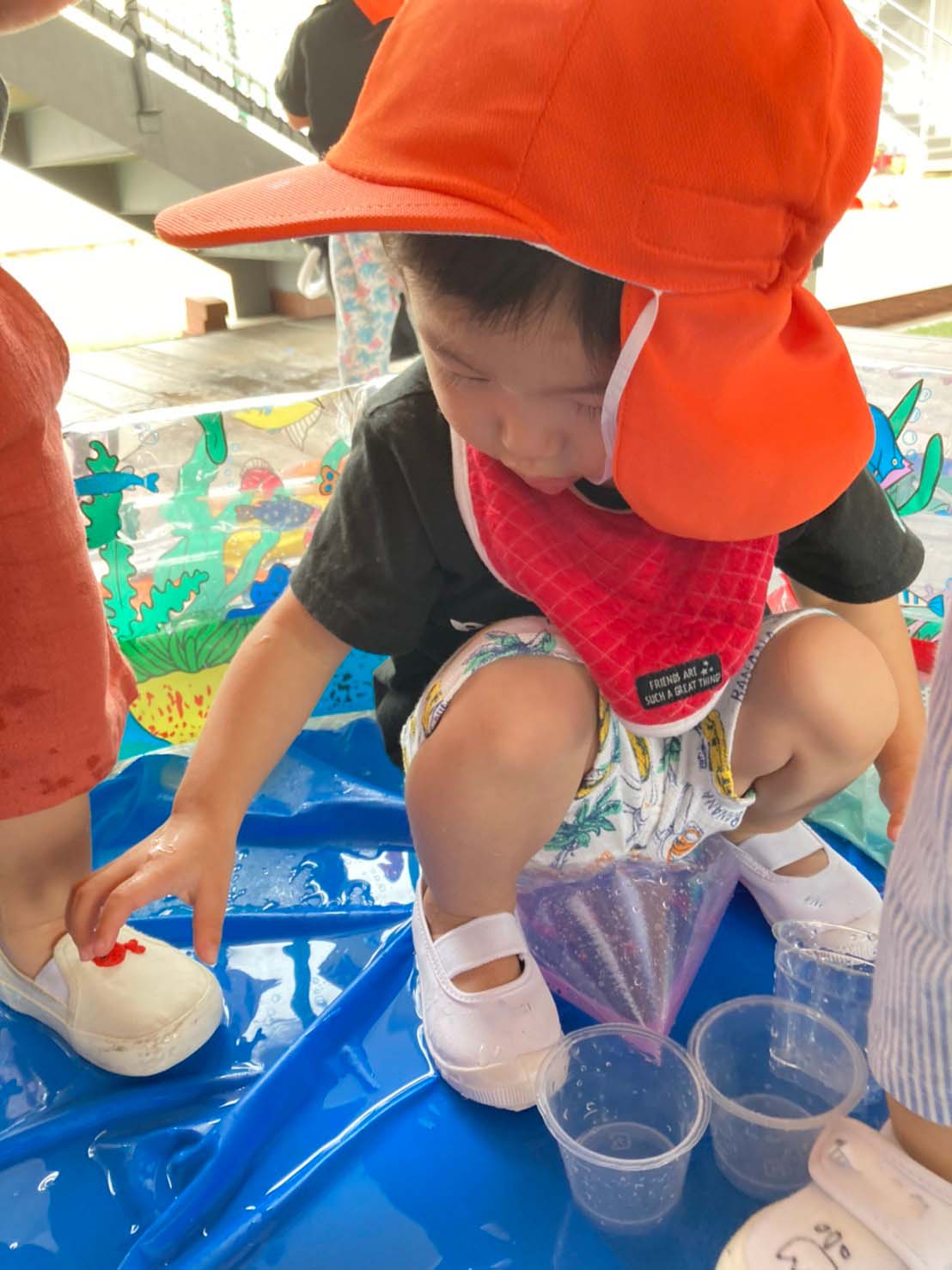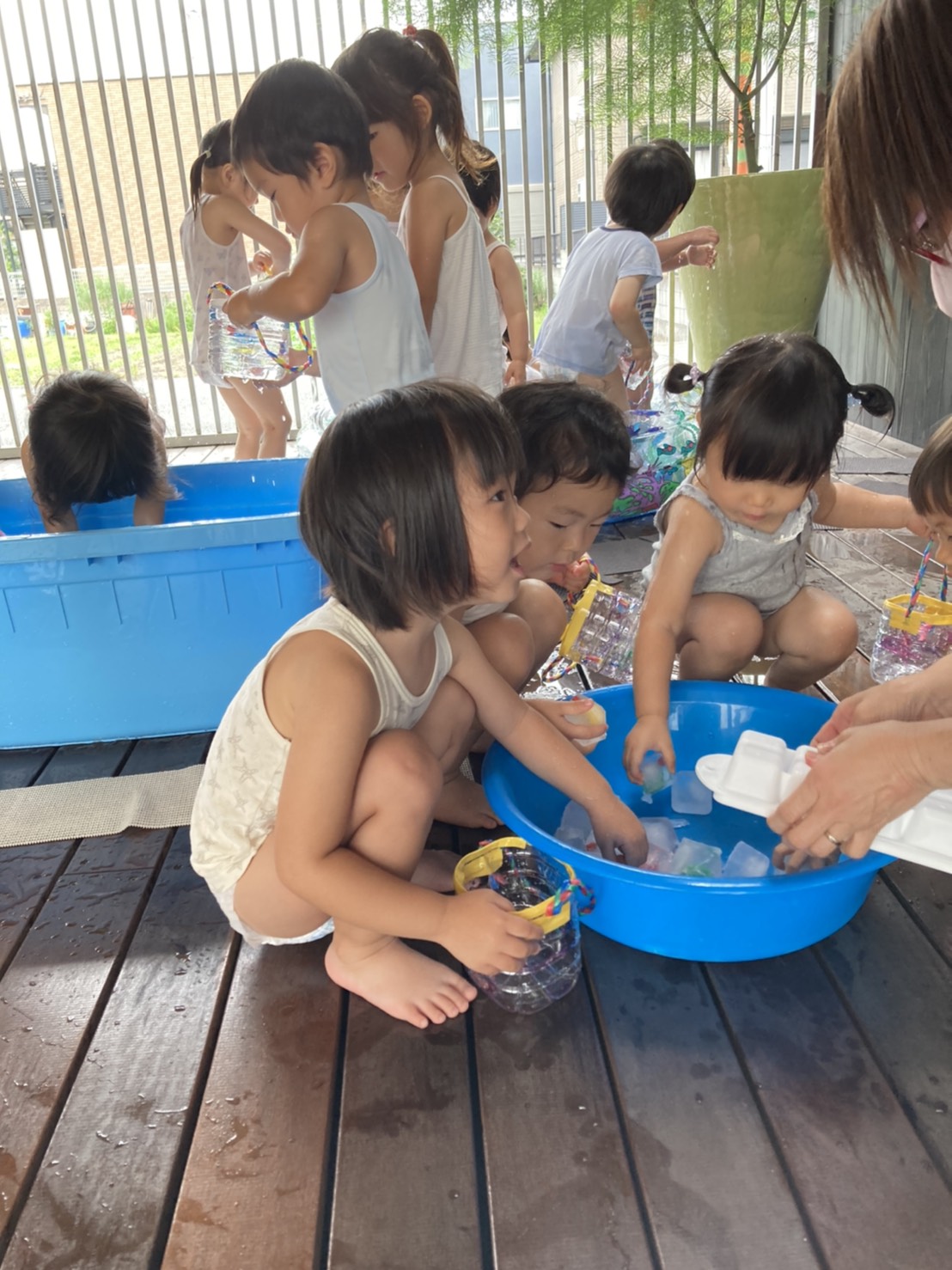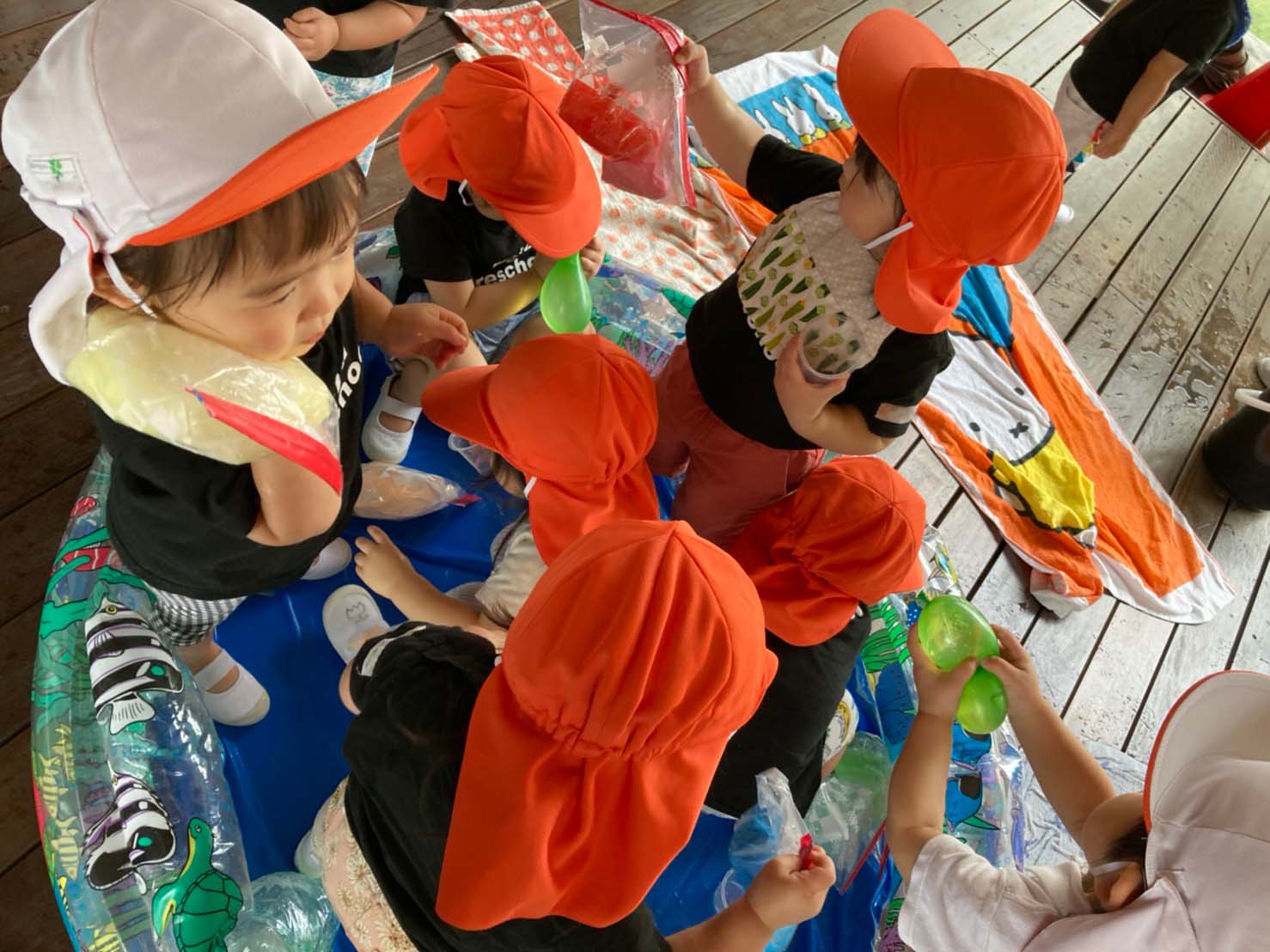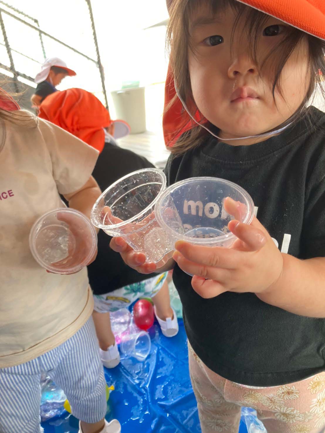 色水を入れた袋を上から触ってみたり、落としてみたり、冷たい触り心地を楽しみました!