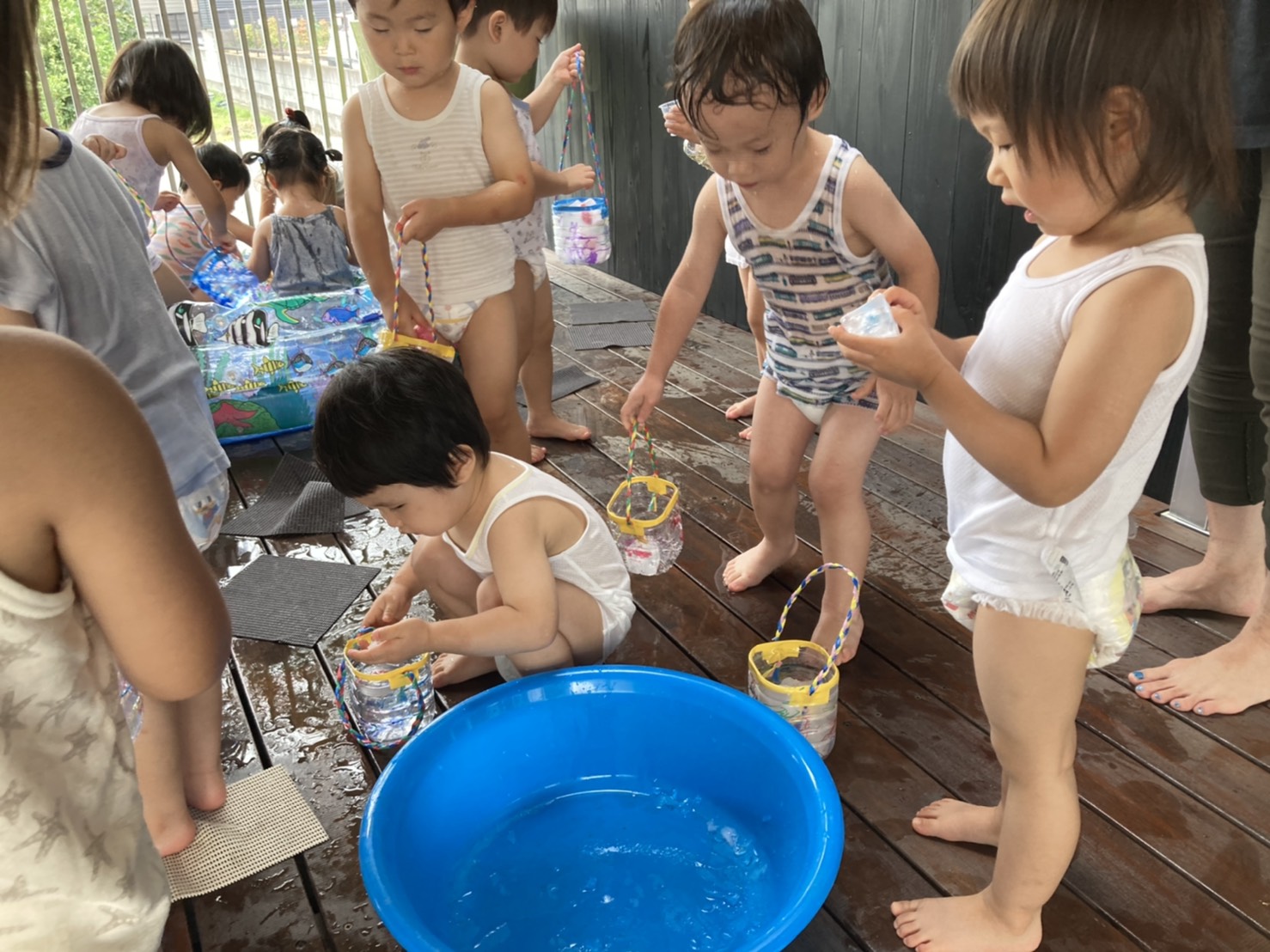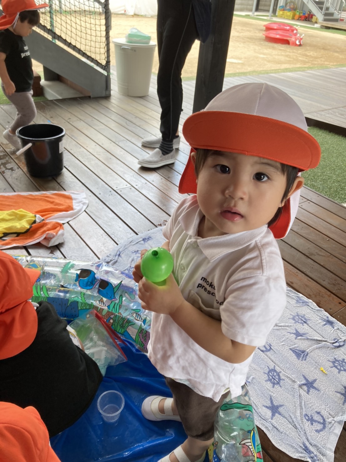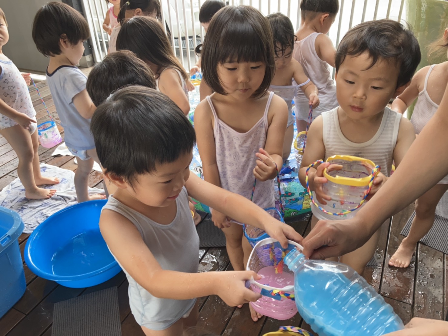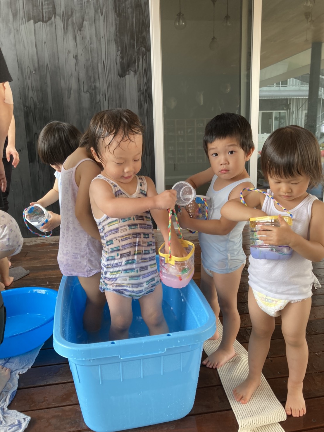 色水を入れた袋を上から触ってみたり、落としてみたり、冷たい触り心地を楽しみました!