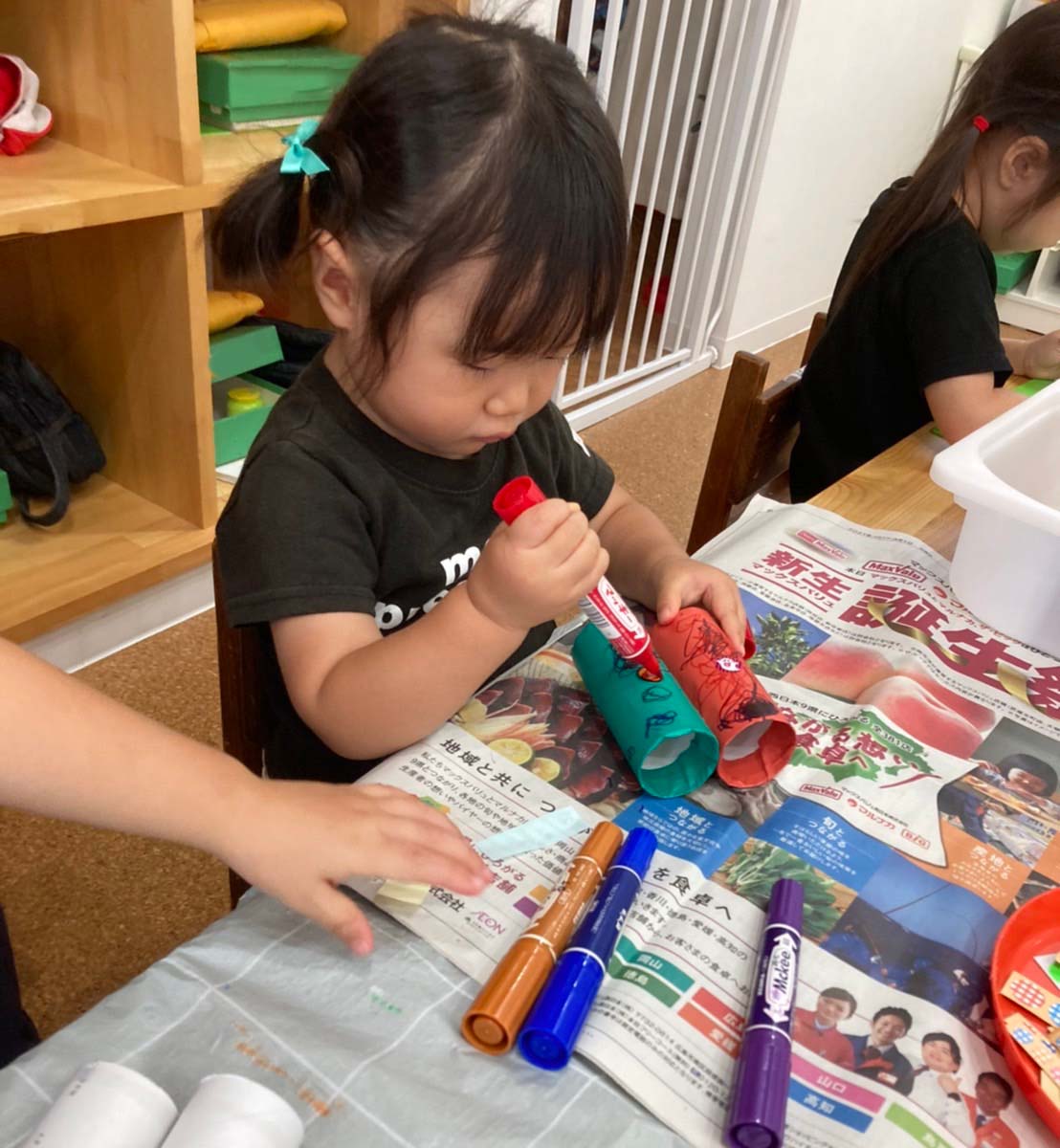 トイレットペーパーの芯に折り紙を巻いて❤️