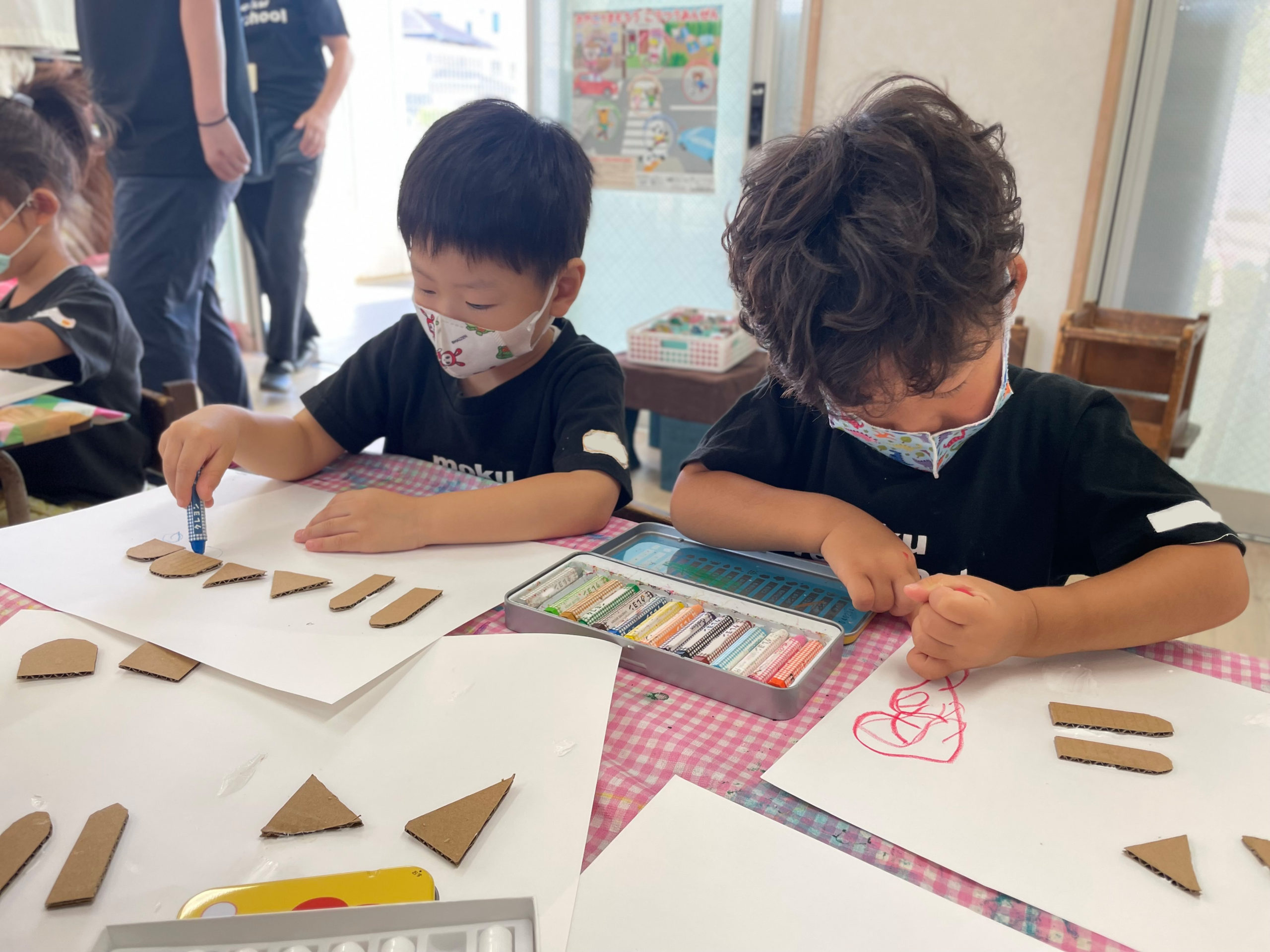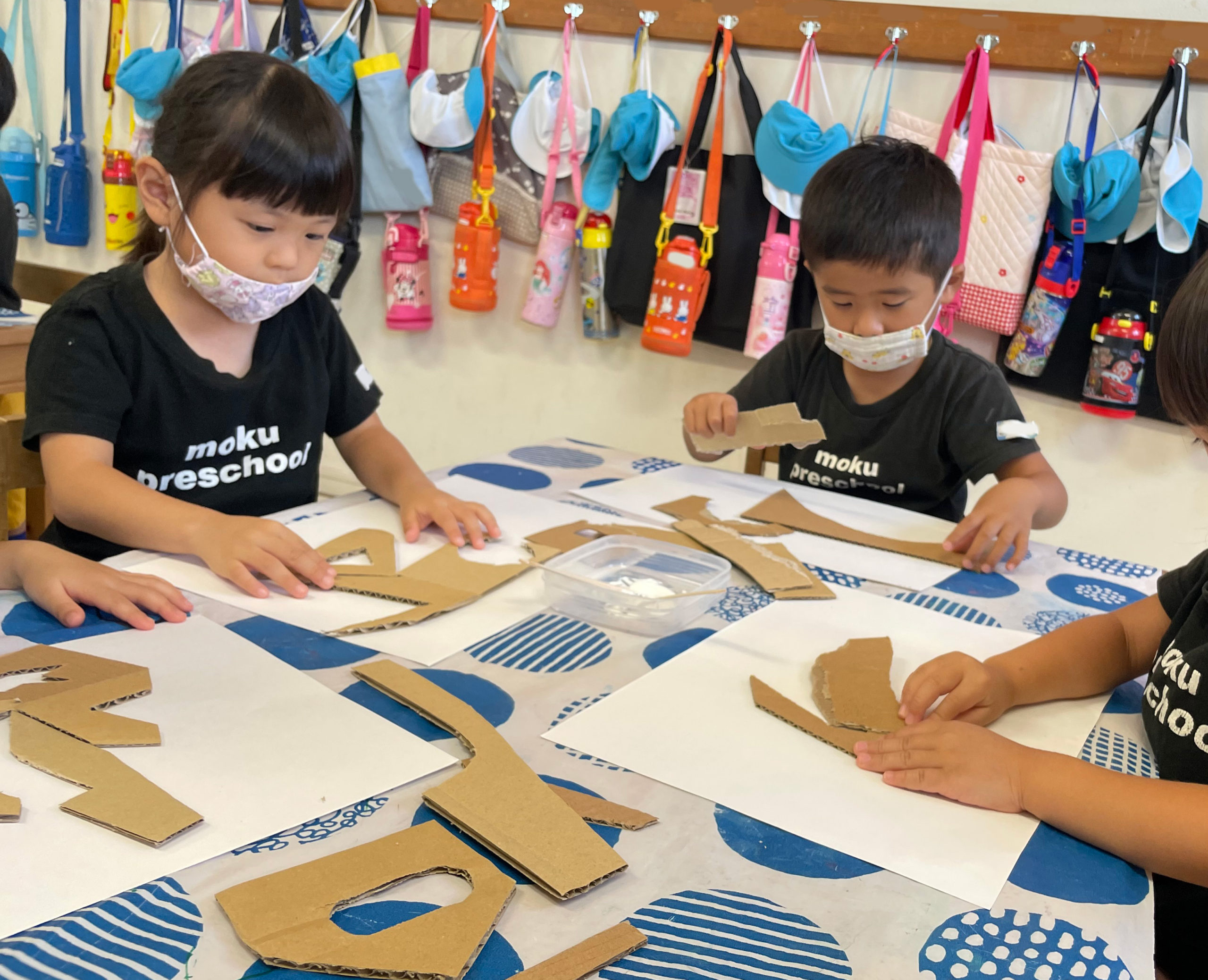 そら組さんは、いろんな形に切られた段ボールを並べて、何に見えるかな👀✨