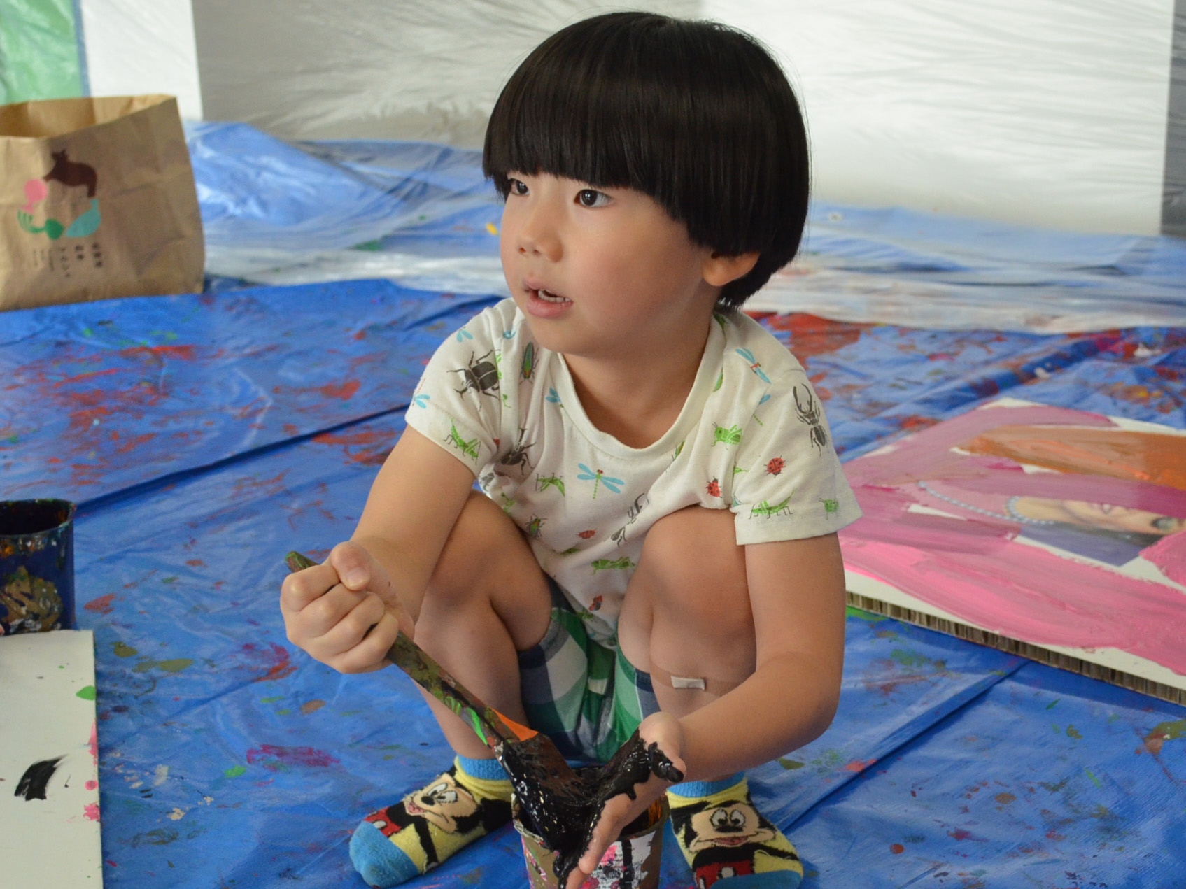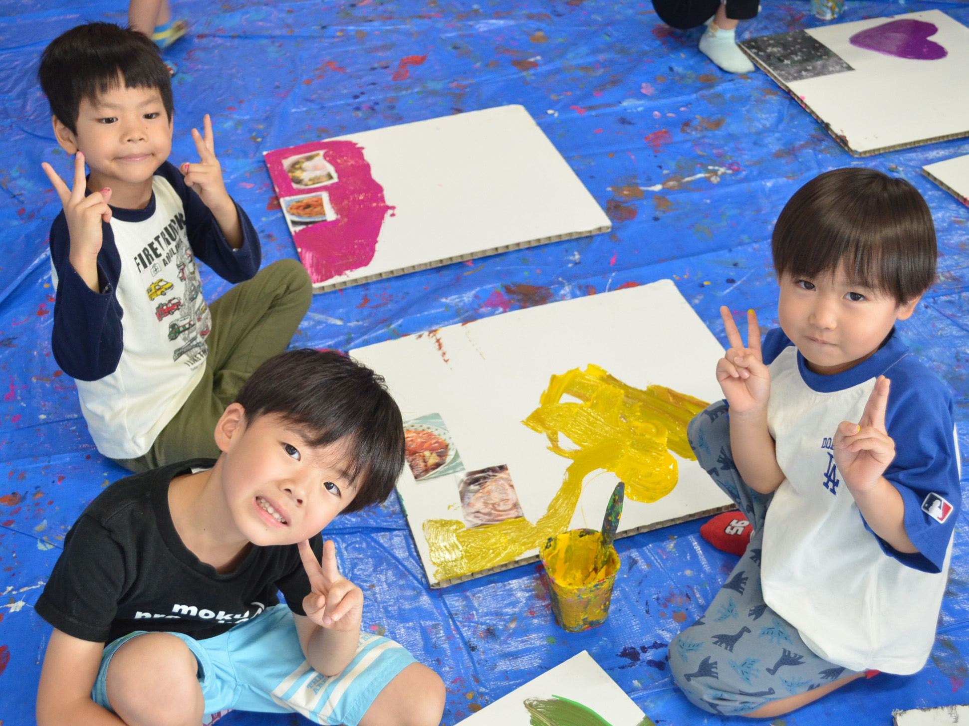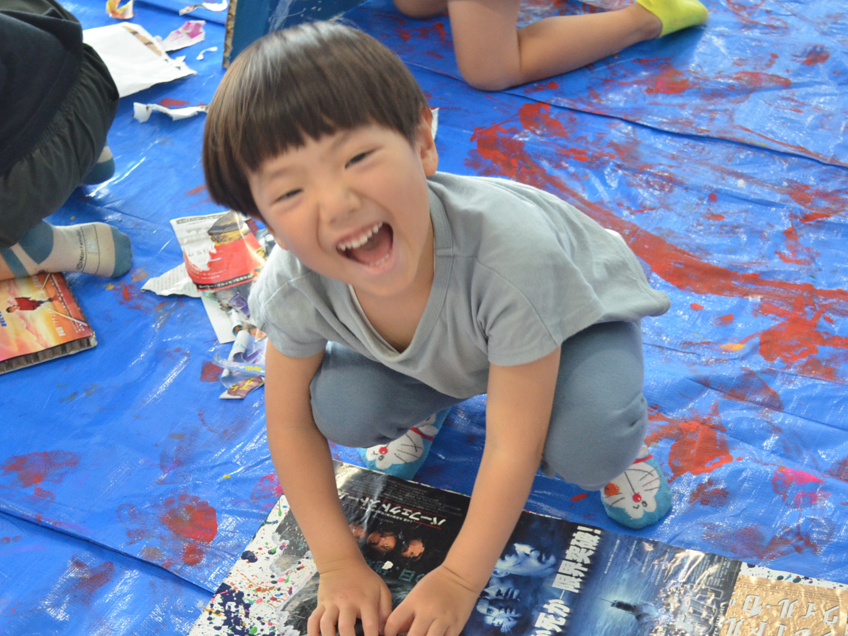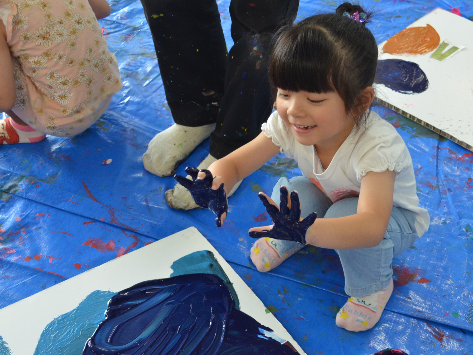 いつもは汚れないように描いている分、初めは手などが汚れることに少し抵抗がある子もいましたが、