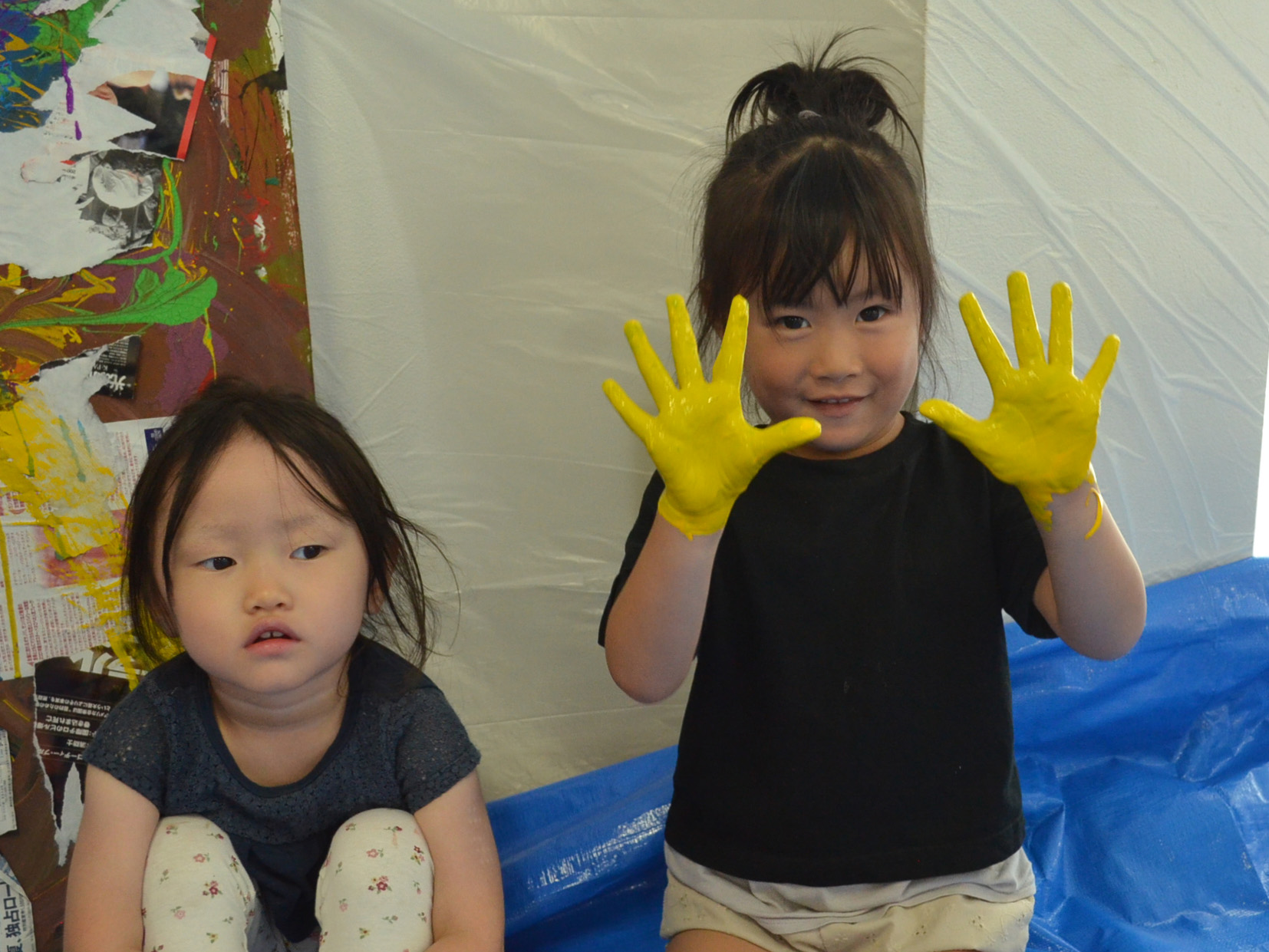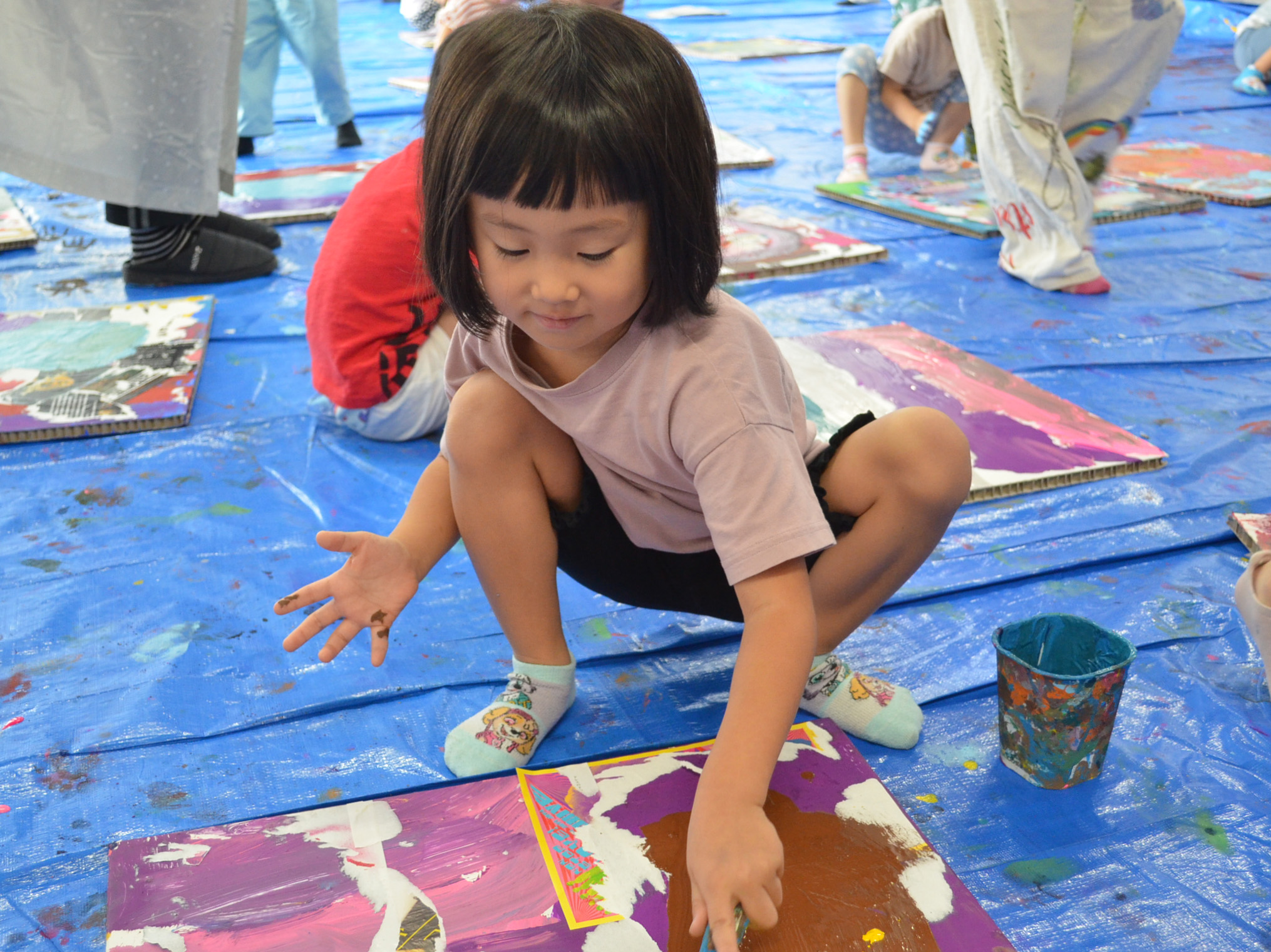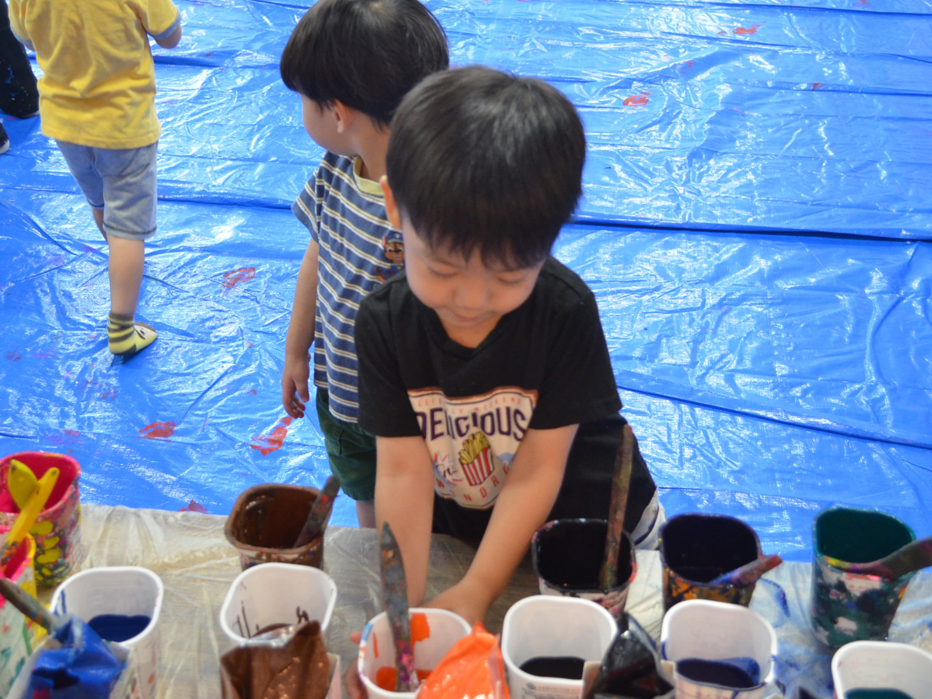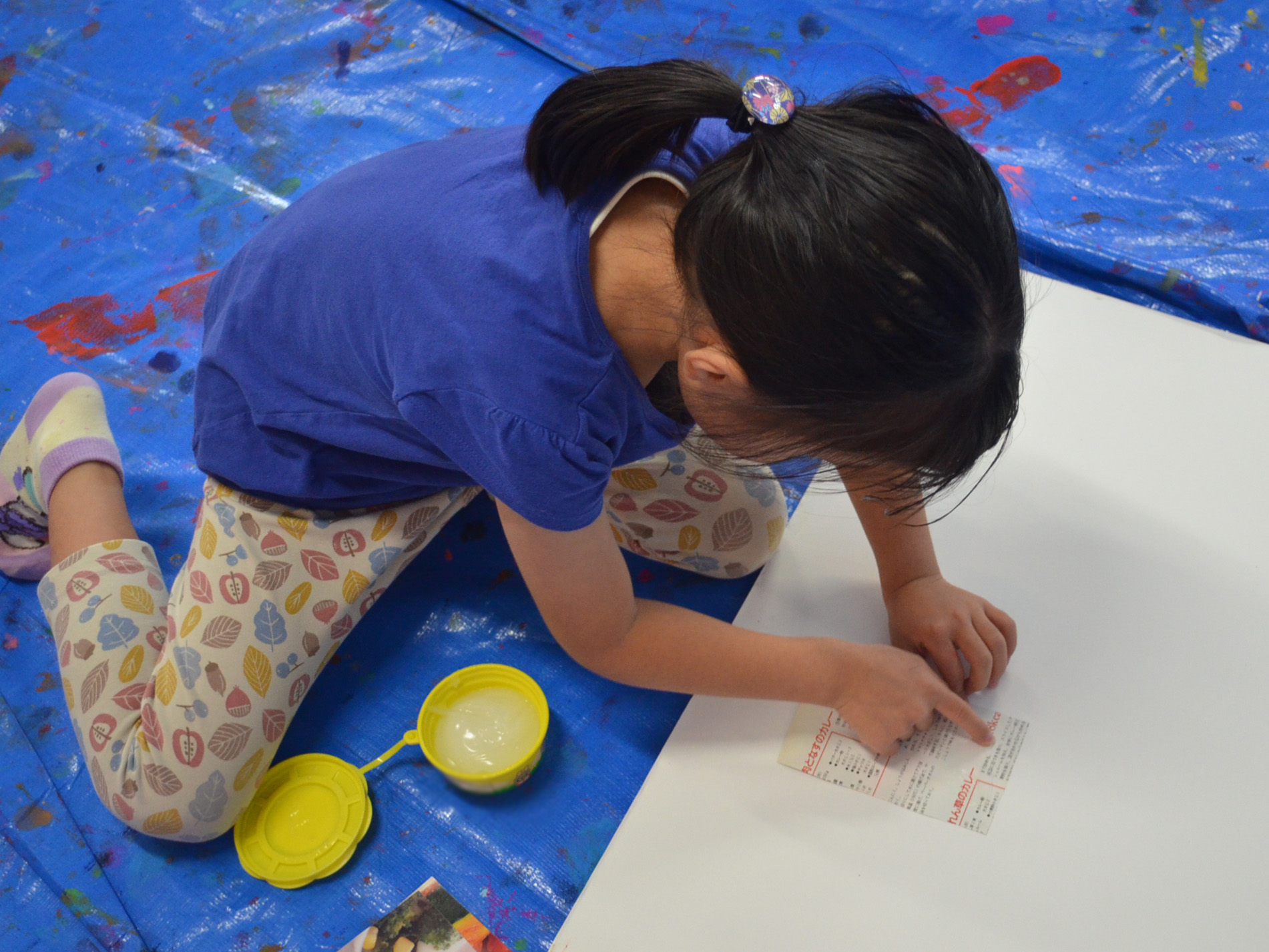 いつもは汚れないように描いている分、初めは手などが汚れることに少し抵抗がある子もいましたが、