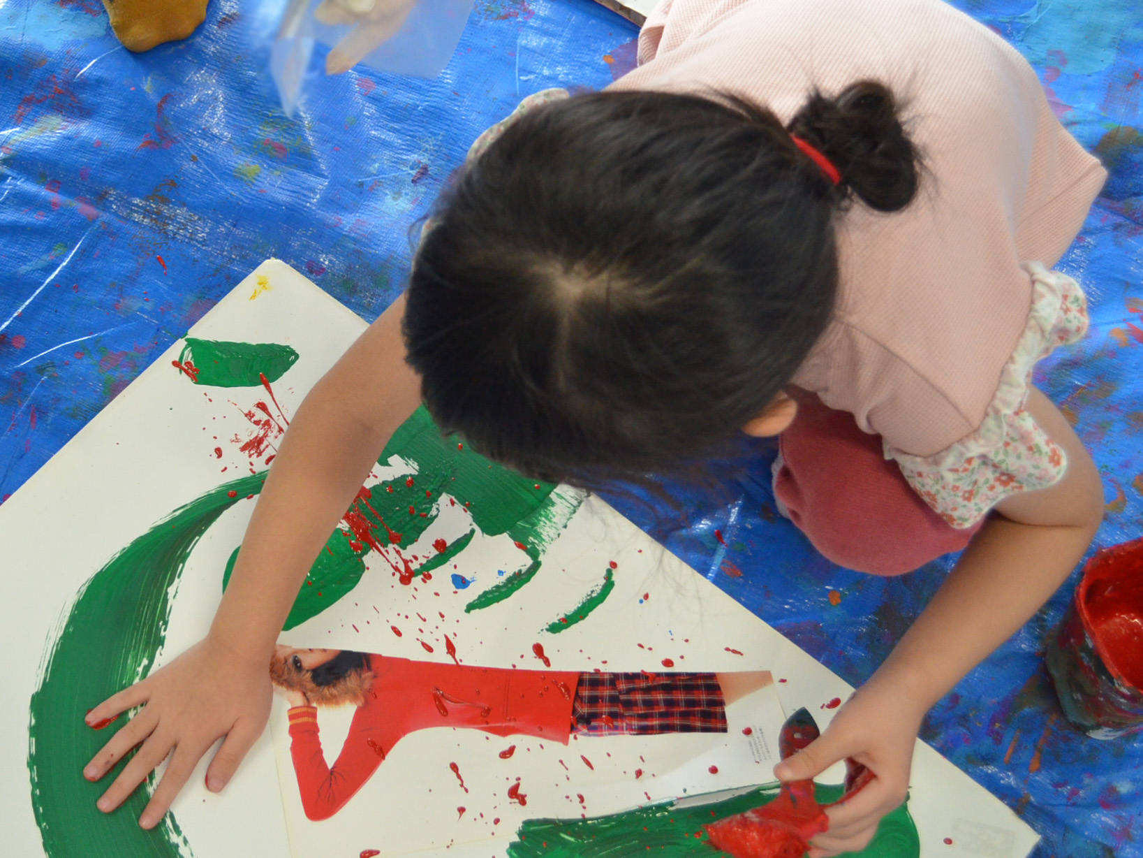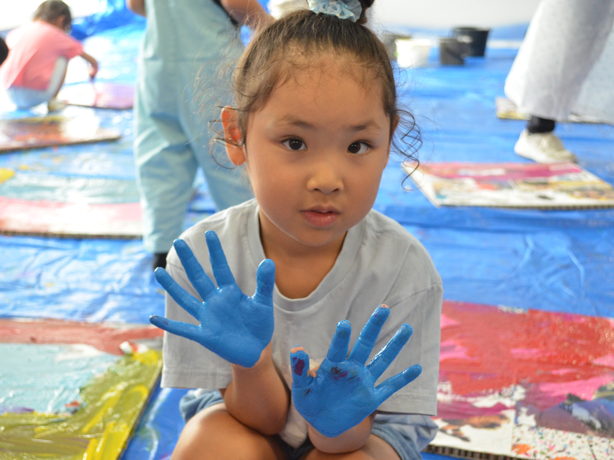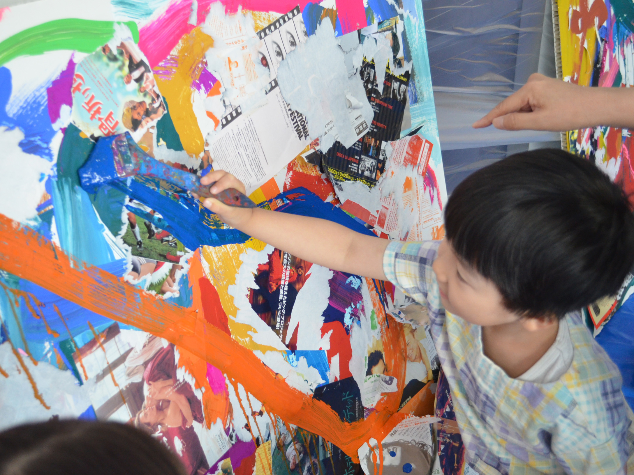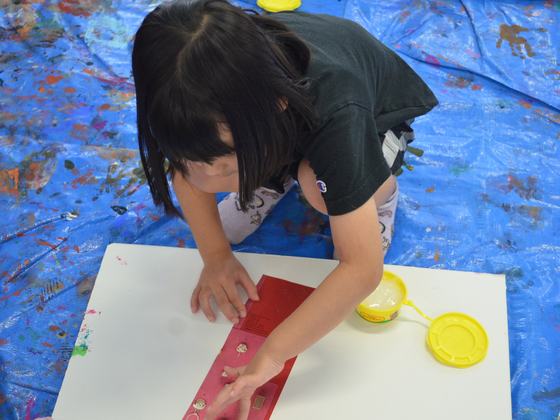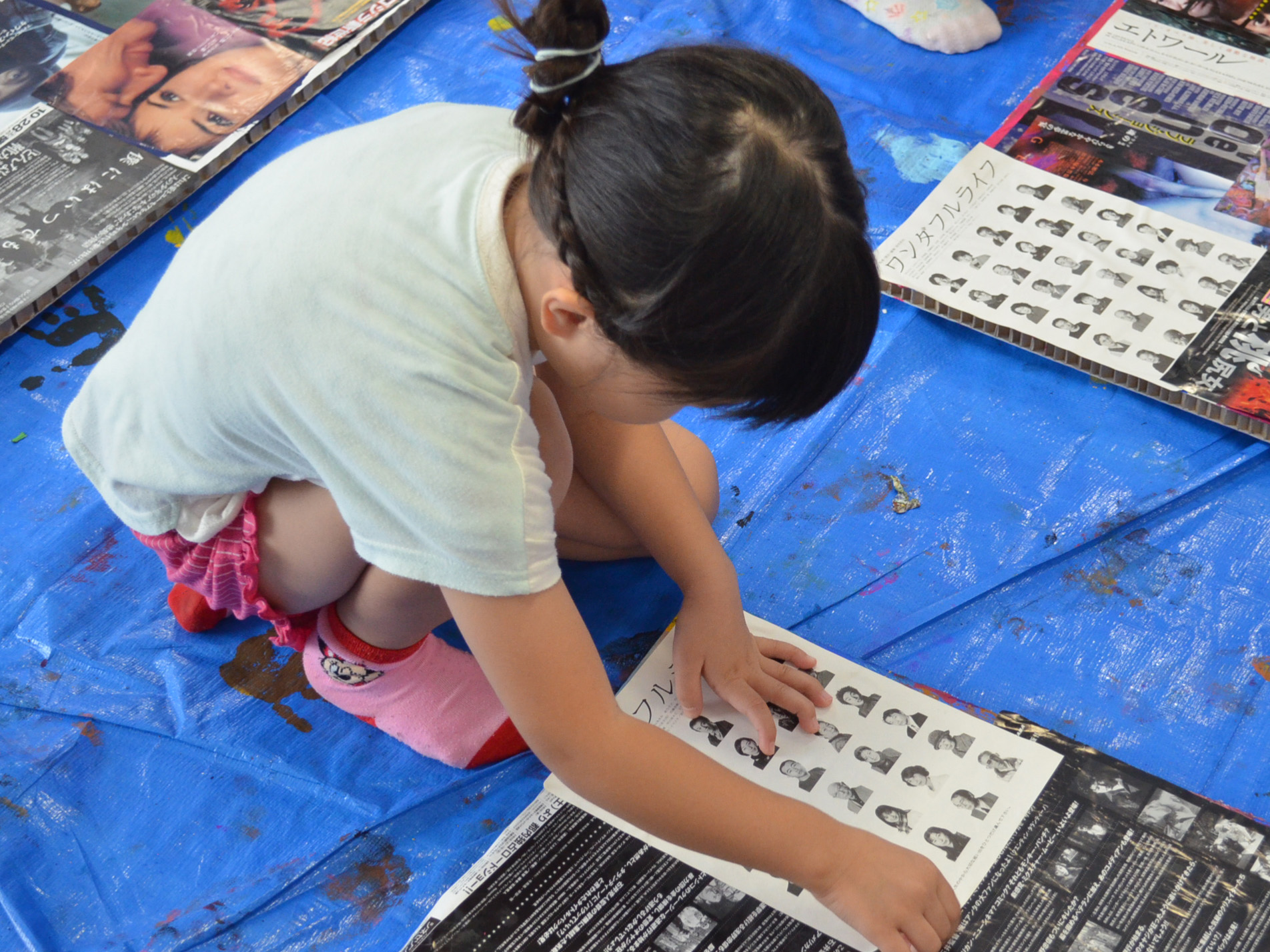 いつもは汚れないように描いている分、初めは手などが汚れることに少し抵抗がある子もいましたが、