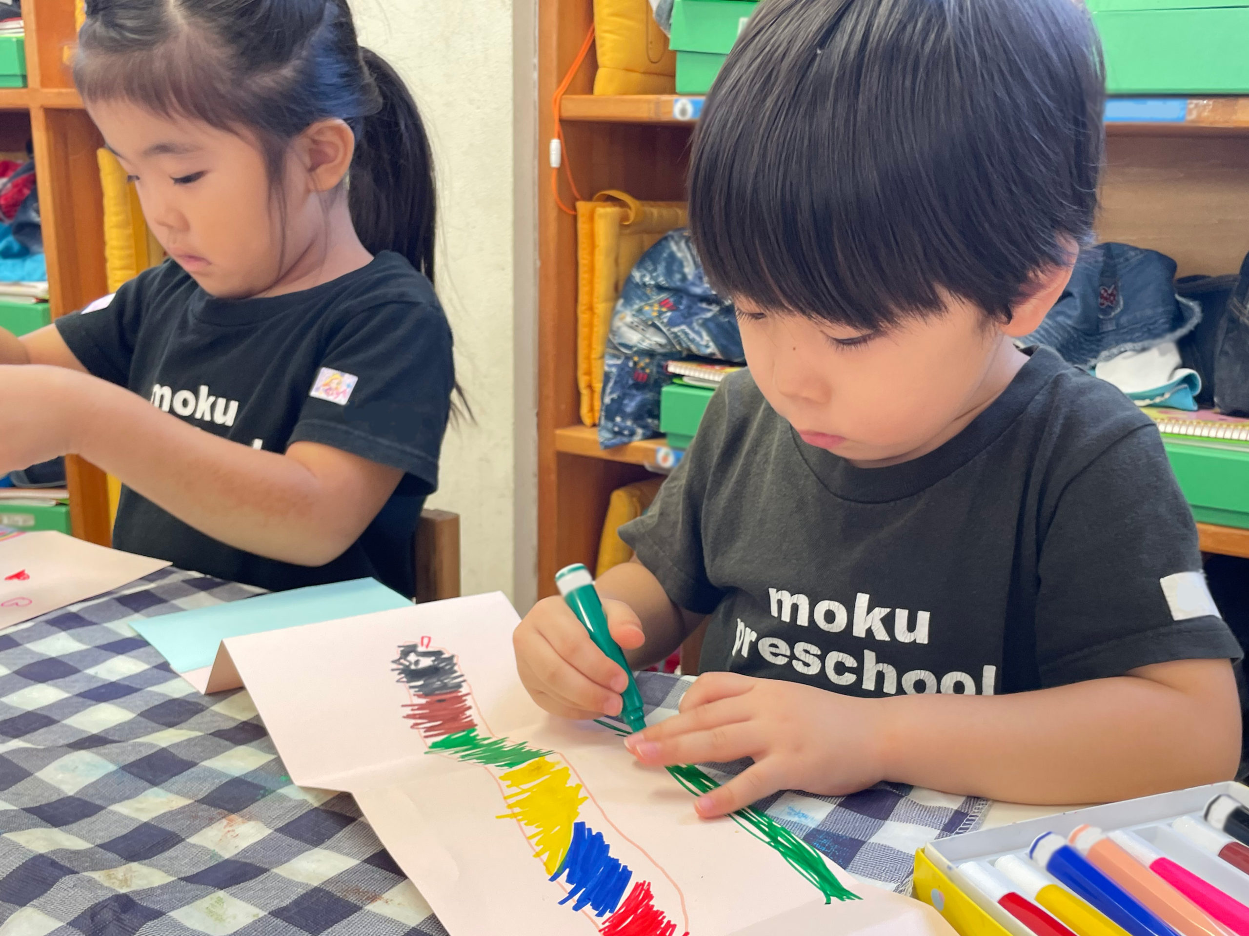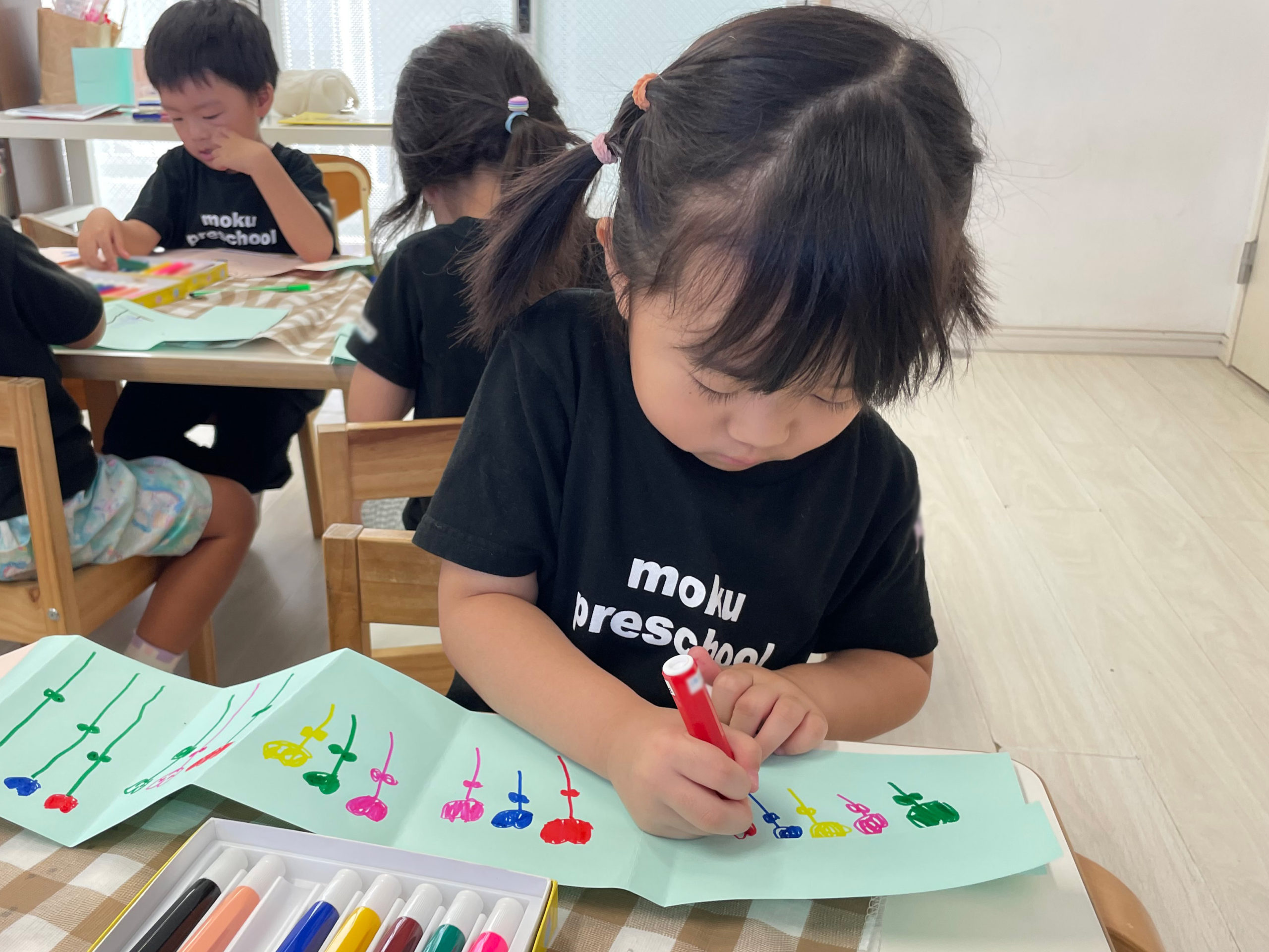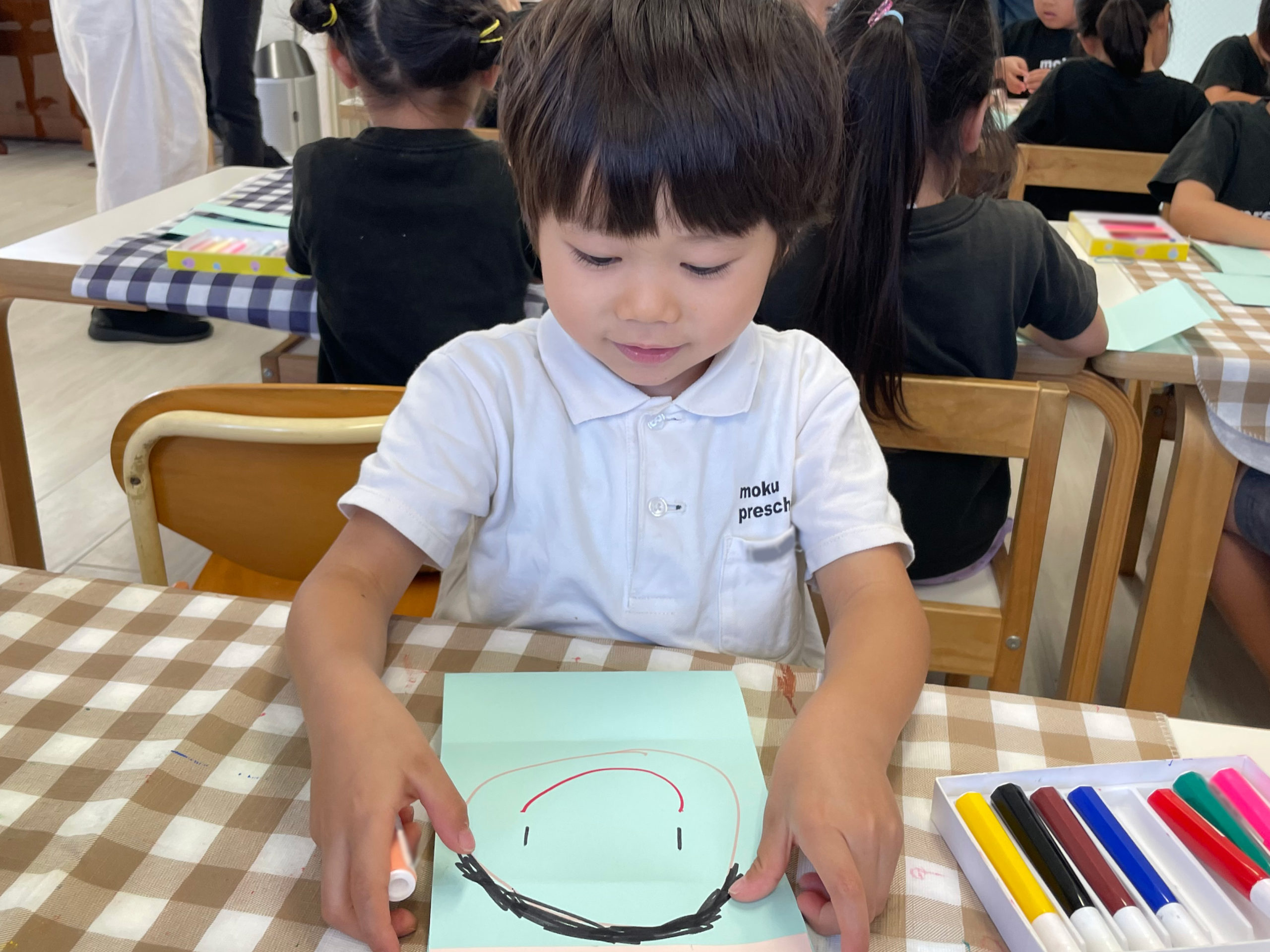 自分の顔や家族の似顔絵・お花畑・電車・へび等