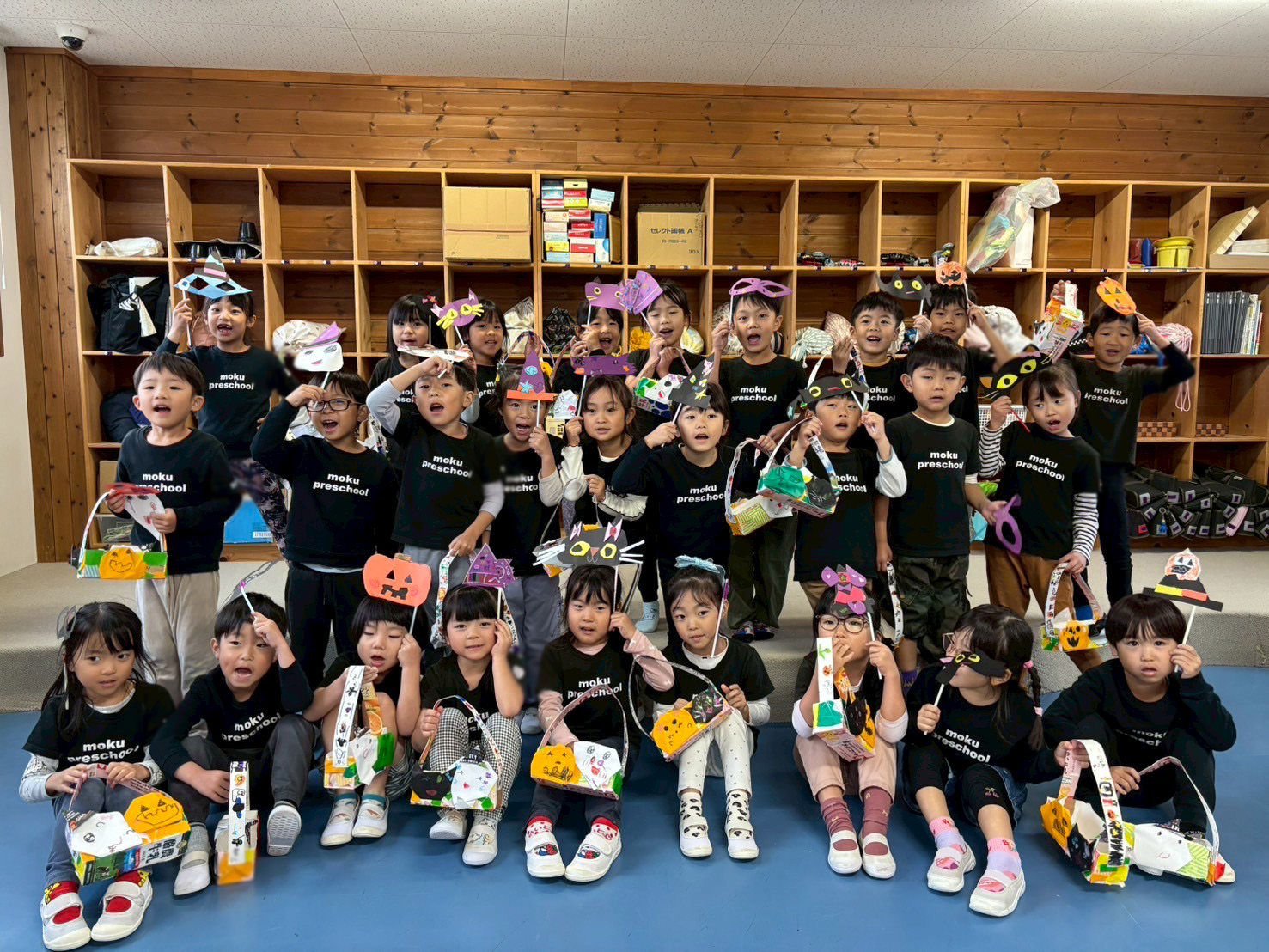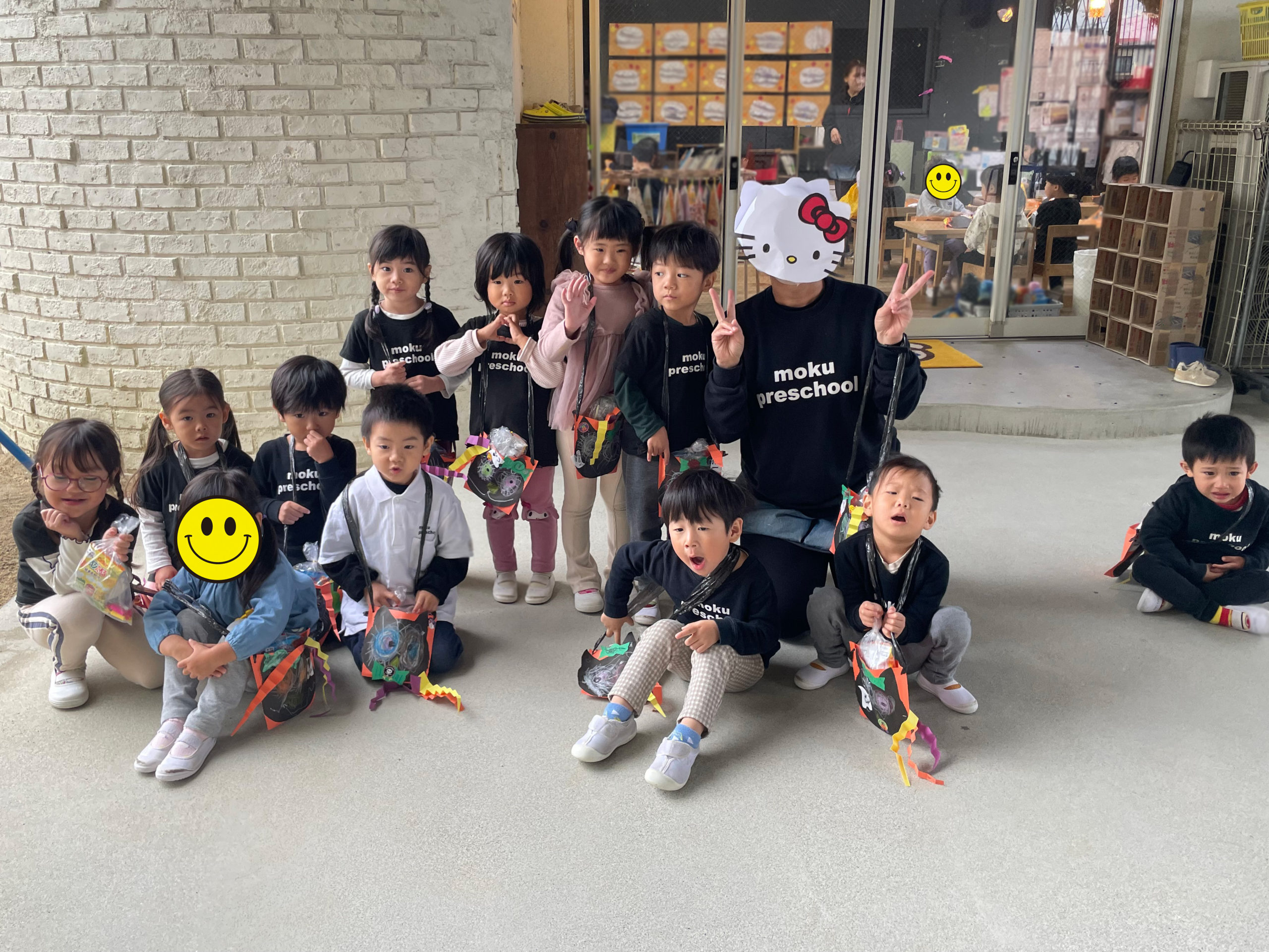 たいよう組さんは自分たちで作ったハロウィンバックと手持ち仮面をつけて園長先生のもとへむかいました👻