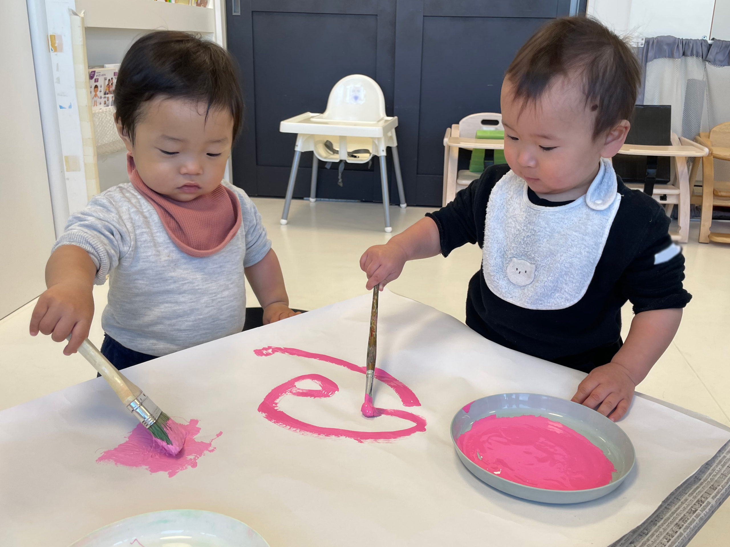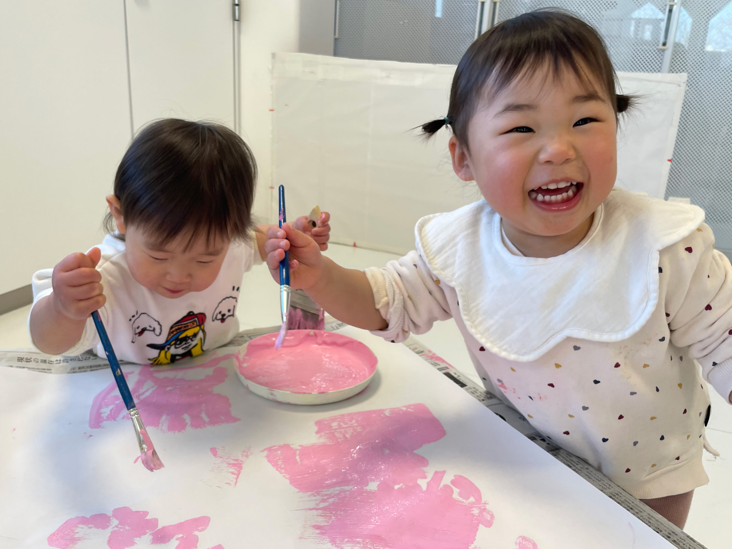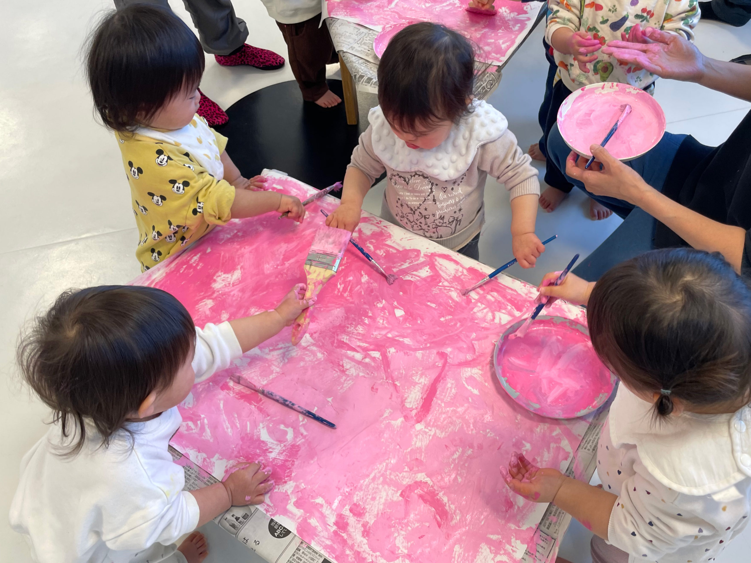 白の模造紙に、はけや筆でピンクの絵の具をぬりぬり・・・💗