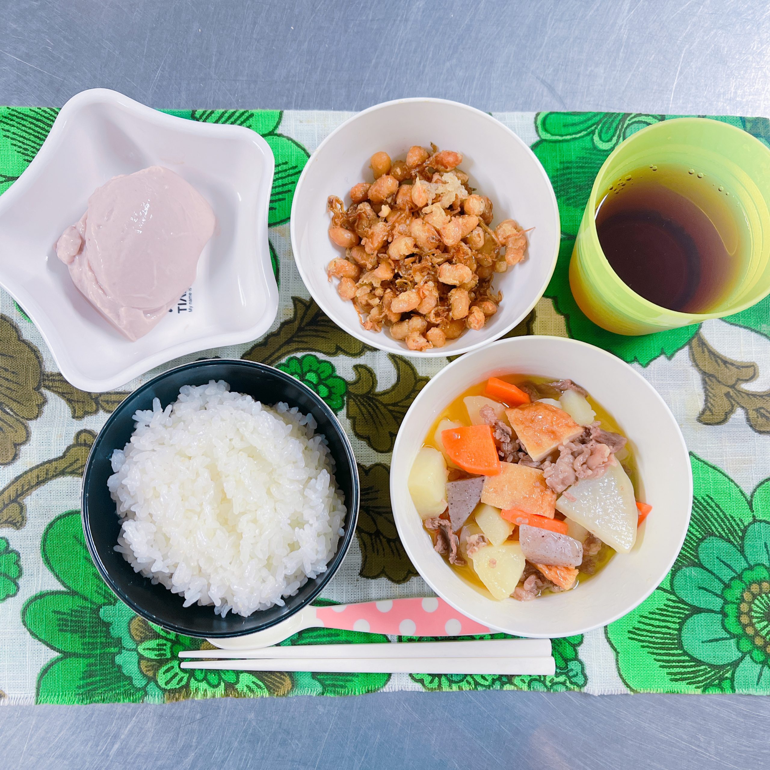 今日の献立はみんな大好きな揚げ大豆と姫路おでん、そしておやつにココアプリンでした💛