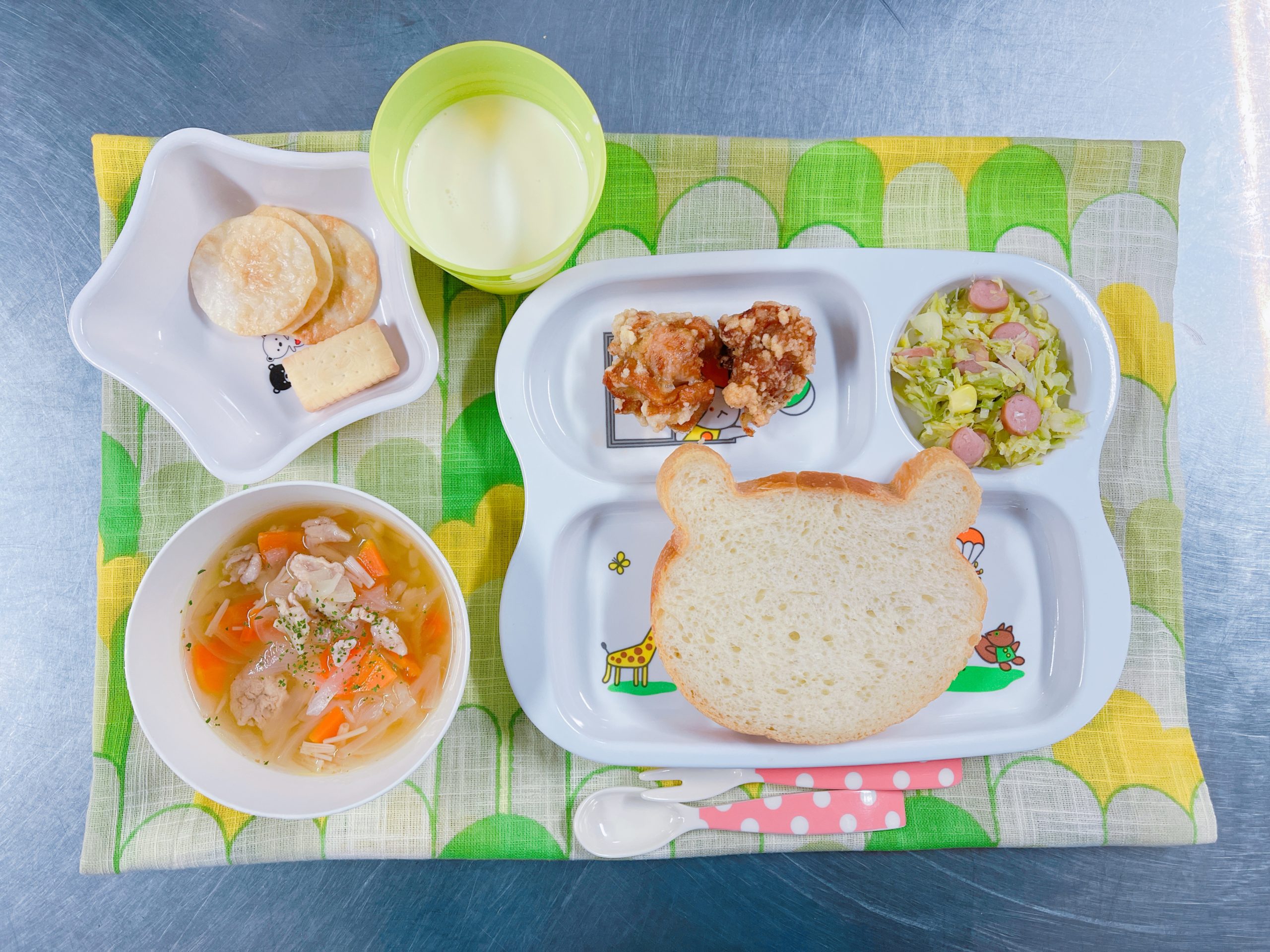 副菜のキャベツはウインナーとコーンをコンソメで和えています。コンソメで和えることで子供も食べやすい味付けになり、よく食べてくれます。今日はどこのクラスも残食ほぼなしでした!!
