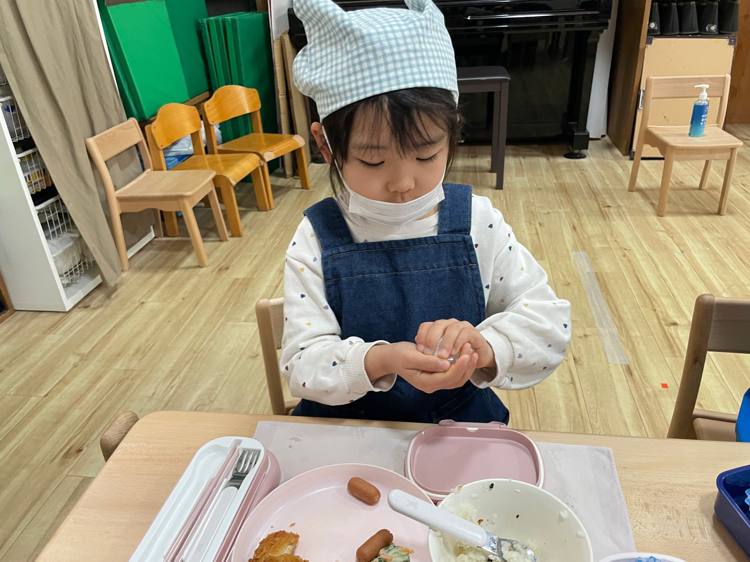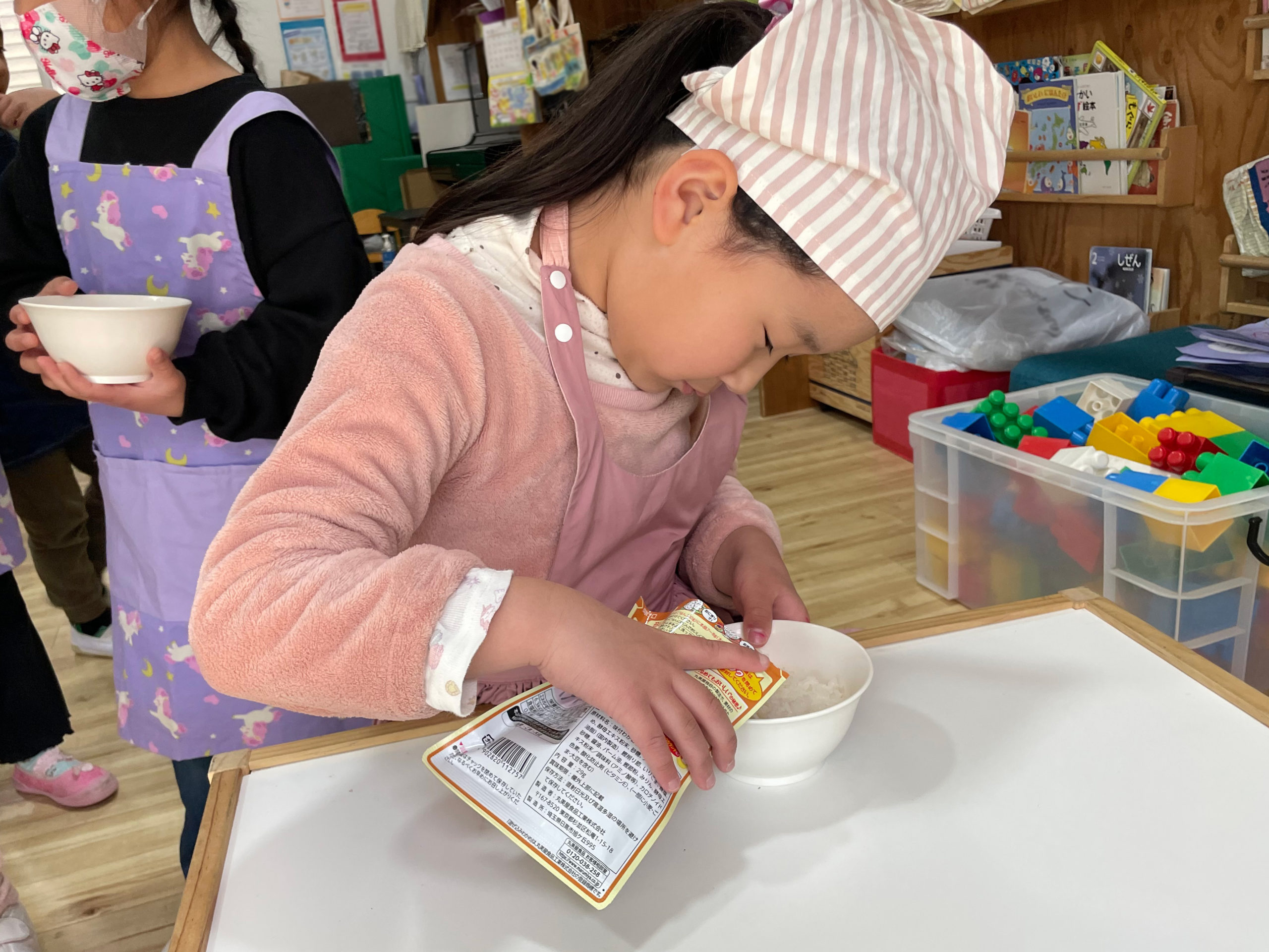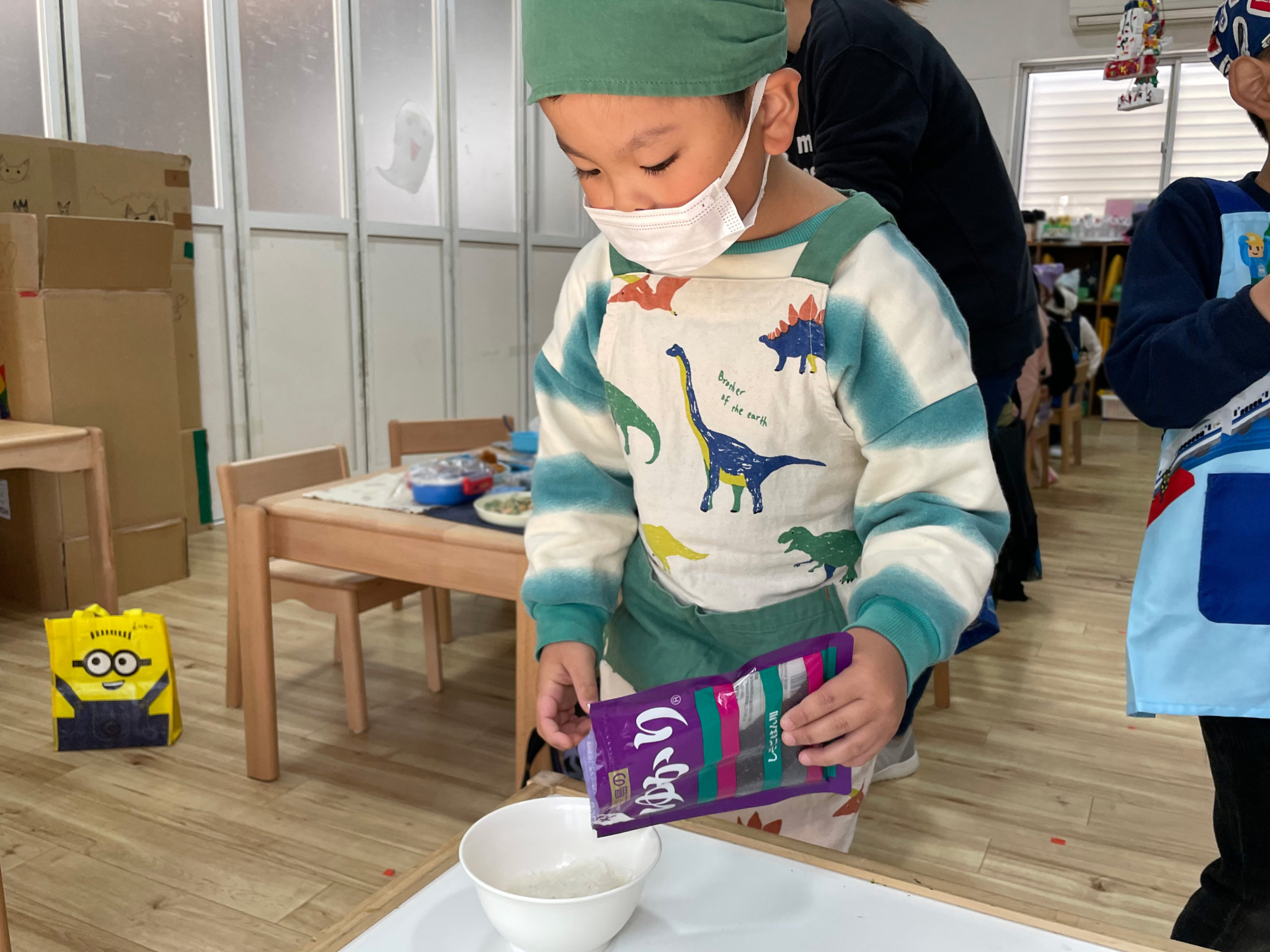 ふりかけを選んで、スプーンで混ぜて、両手でにぎにぎ・・・