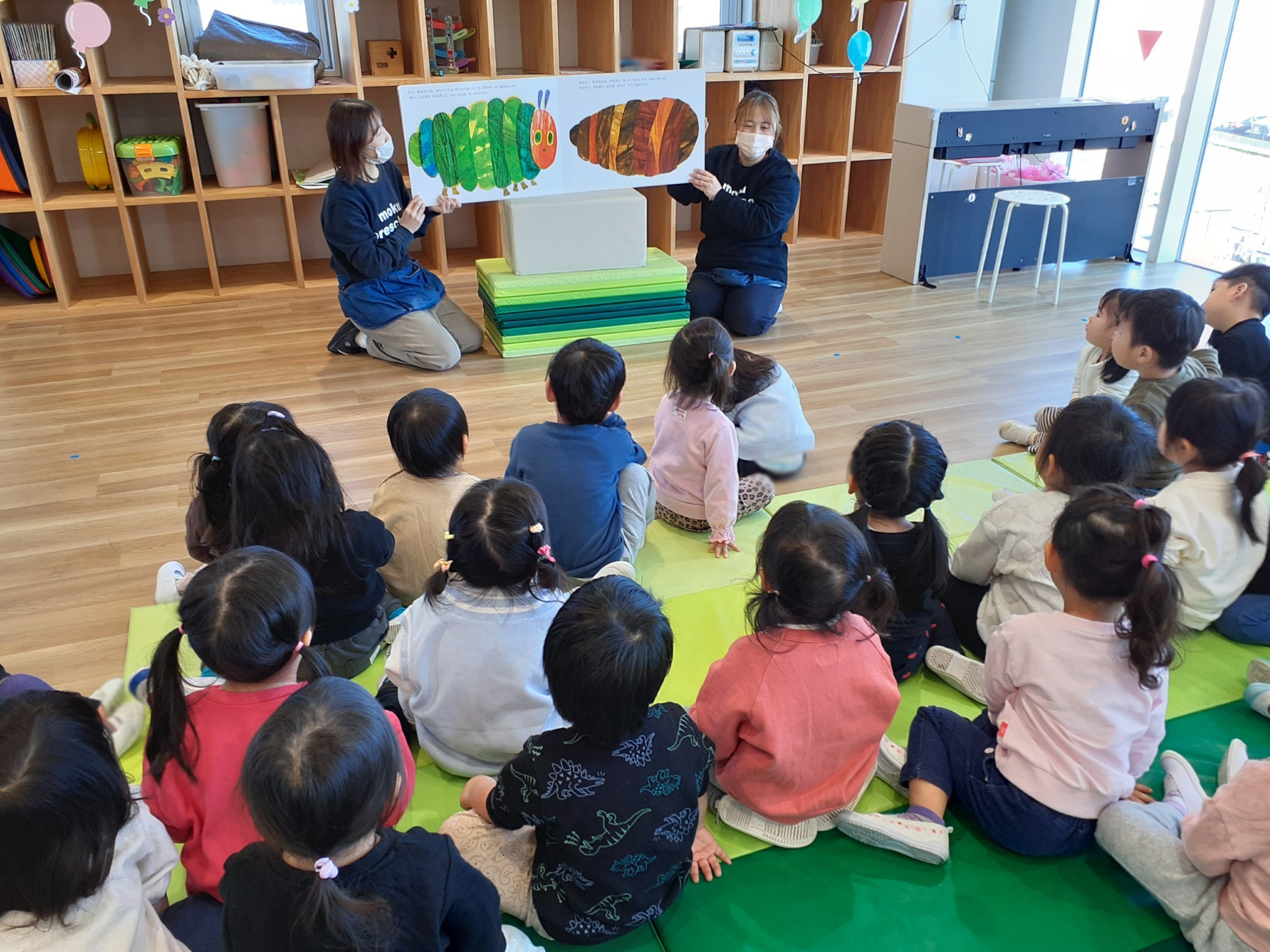 先生が「はらぺこあおむし」の大きな絵本を読んでくれました🐛